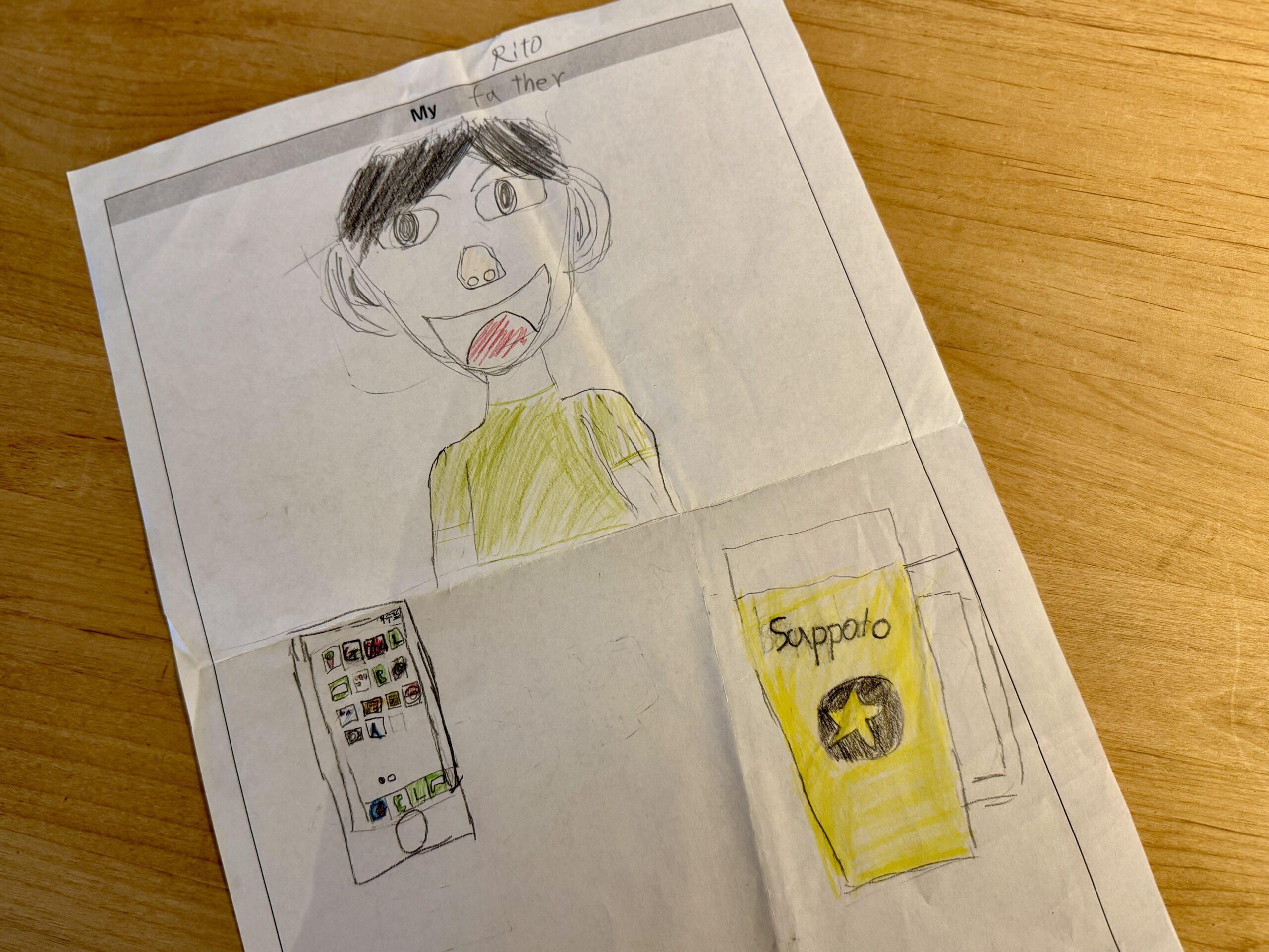 水曜日は英語の日。父ちゃんについてスピーチするって話は聞いていた。「ちょっと話してよ」と言ったら、「やだよ」と言われたけど、チラッと紙を見せてくれた。英語が上達しているかはわからないけど、絵がめっちゃ上手になっていて驚いた。(あ、あくまで息子的上達です。)