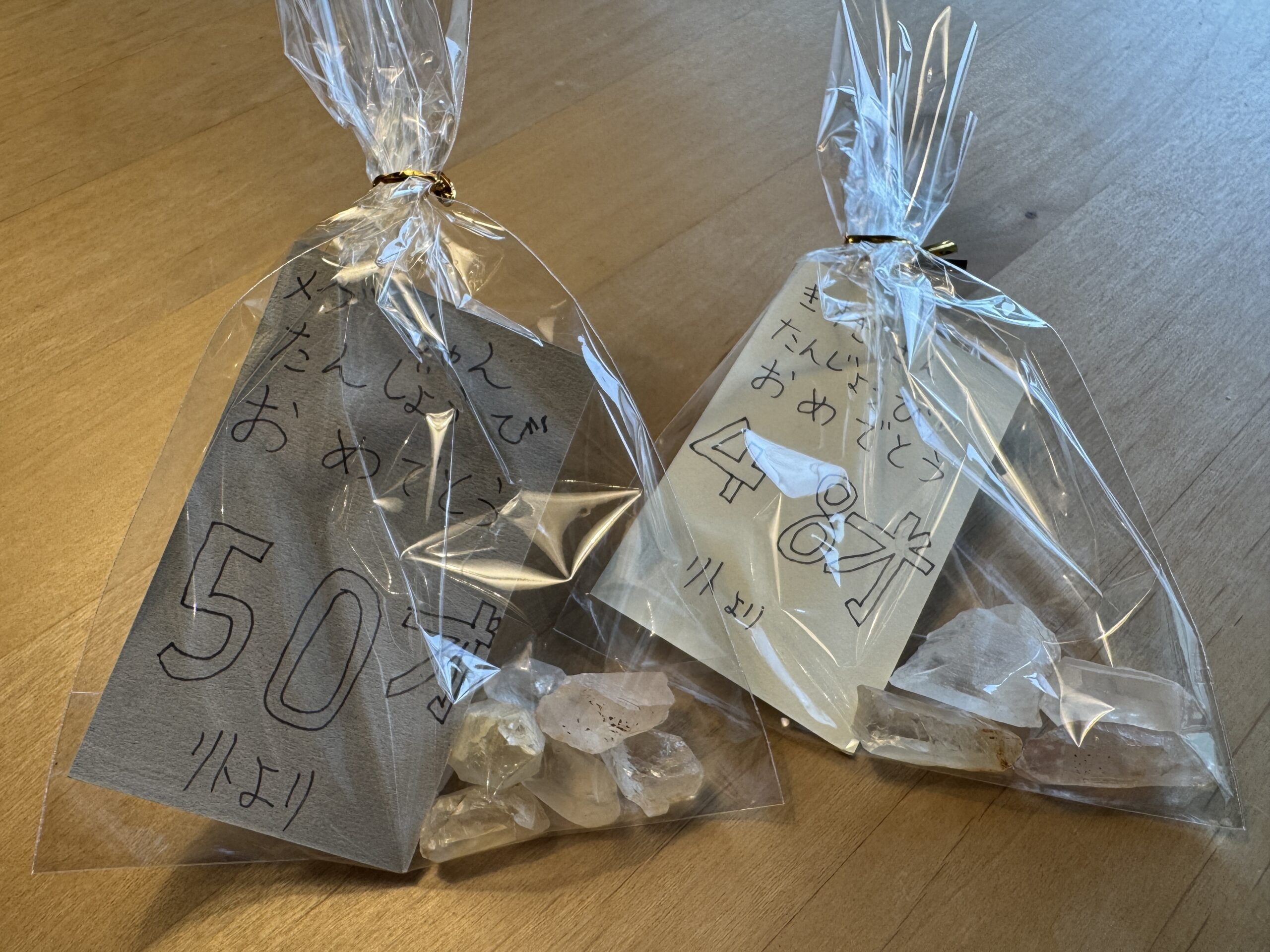 主役だけではなく、実はもうひとりの友人も少し前にお誕生日だったので、わたしがちょっとしたギフトを用意してたのを知る息子は「半分こしてふたりにあげるよ」と、水晶を測りに乗せてぴったり半分に分けていた。笑