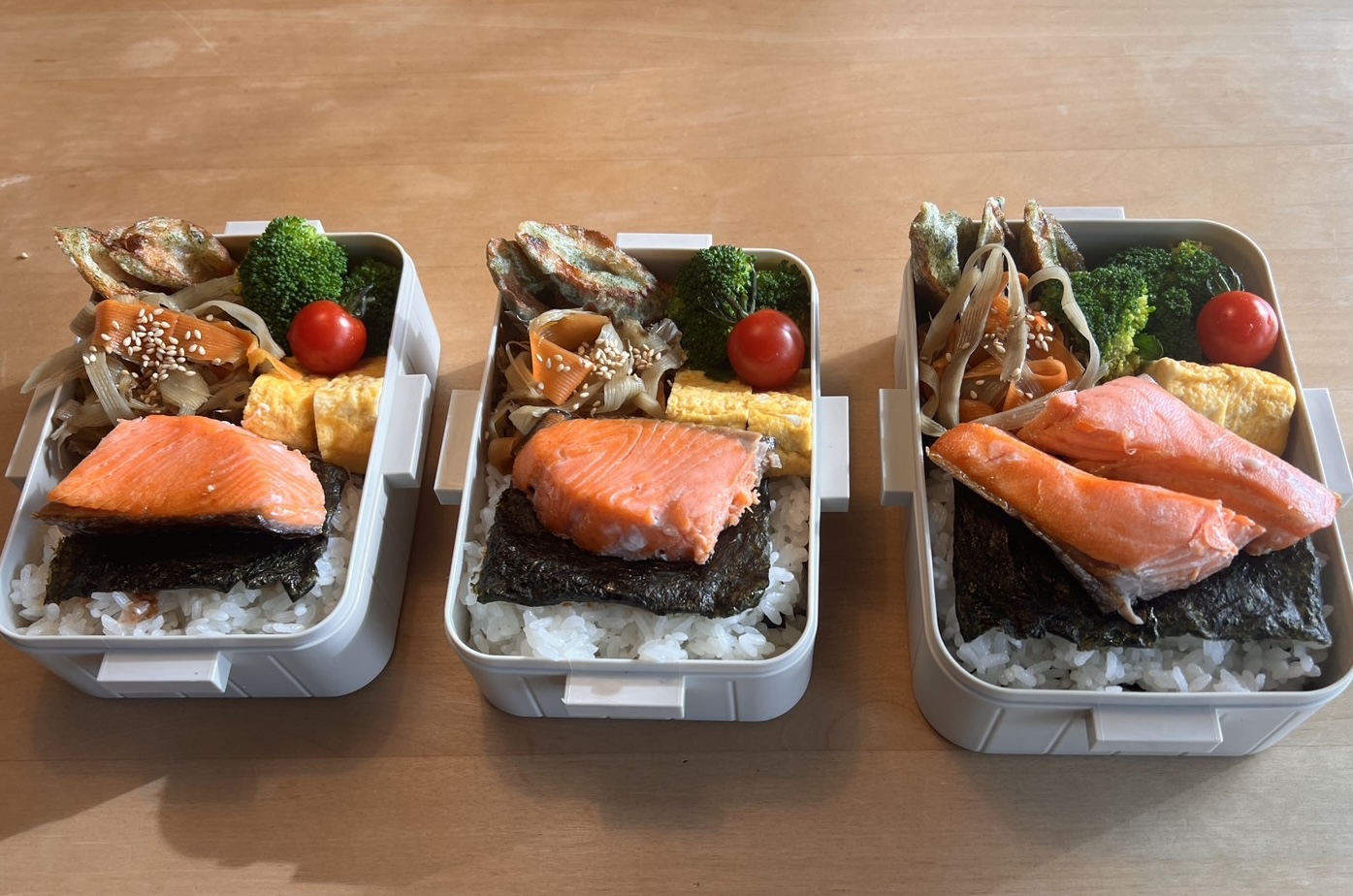 父ちゃん作、ふるさと納税のシャケ弁。息子は今日もお弁当を持って祭りへ。