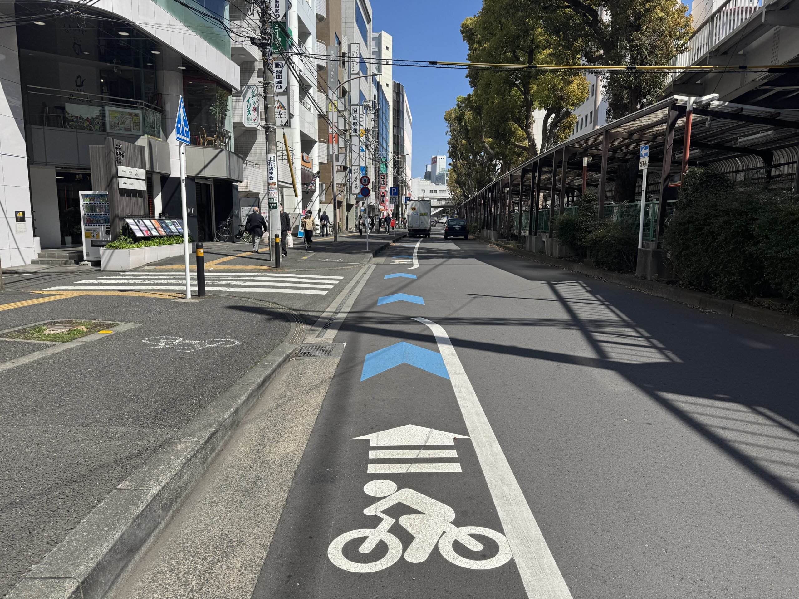 自転車の新ルール、この道路はまだ幅があるからいいけど、デカデカとサインこそしっかりあるけど、どう見ても自転車の後ろに車が渋滞しちゃうよね?みたいな道も沢山ある。あとさ、前のトラックみたいに歩道に寄せて路駐車が連なってるパターンとか。