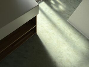 途中陽がさして、洗面所に採用した床材がとてもいい色だった。