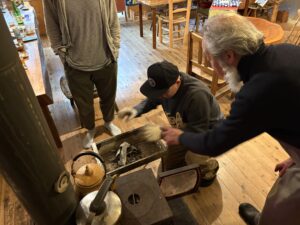 まさかのレストラン内で炭をおこす。当然笑っちゃうくらい煙だらけで、寒いけど窓全開。温まった体は一瞬で冷えた笑