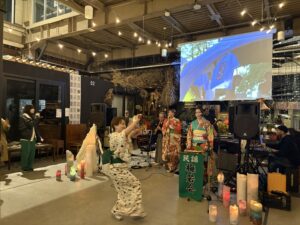最初のライブは秋田民謡梅若会。写真中央で踊る白い着物の女性が中学校からの友人で、民謡一家で育ってきた彼女。中学の時は彼女の家によくたむろしていた。久々に梅若会の演奏を見たが、今では彼女がしっかりと進行を務め、立派な歌い手となっていて感動した。