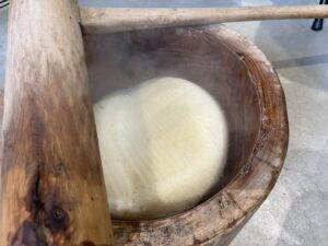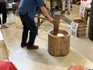 百姓のこーせいさんの格好いい腕っぷしでまずはある程度ついていき、その後は出店者やお客さんが交代しながらついていく。子供も大人も杵の重さと餅の粘りにかなり苦戦していた。