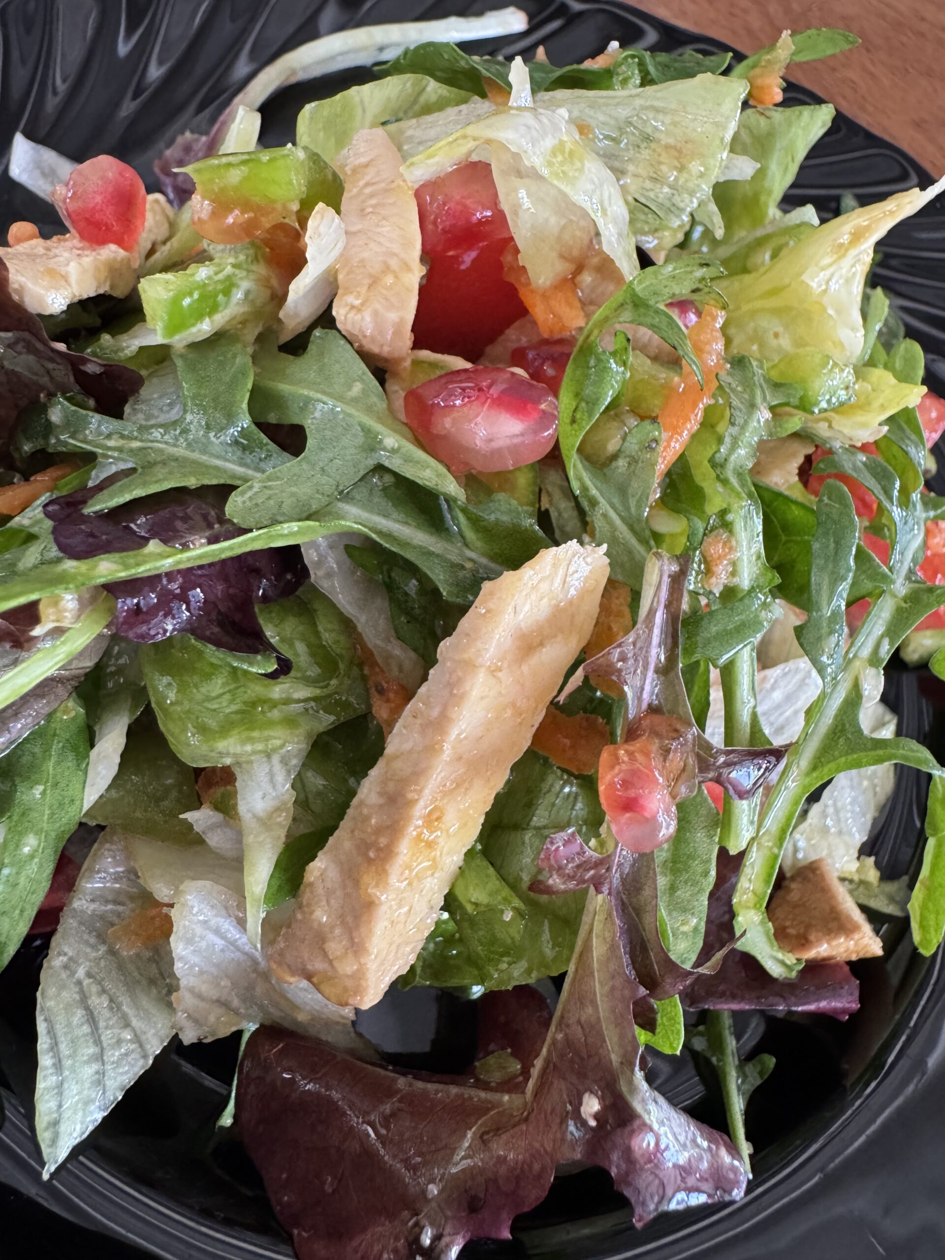 Hoy comimos ensalada con pollo que hice ayer y granadas de nuestro jardín, sabía que no iba a cocinar nada “complicado” , sabía que quería comer algo saludable tanto para mi como para Vanessa, ayer cenamos kfc, después de ver una serie smde pollo frito coreano, nos apetecía mucho, pero no fue exactamente como imaginamos, gordo si me sentí por comer fritanga barata, pero ni satisfecho ni contento. Hoy viendo que lucía un sol fantástico, cogí la harley y me fui a buscar a mi querida esposa al trabajo, dimos un pequeño rodeo, entre viñas y bosque y una preciosa arboleda que nos lleva directamente a casa, al llegar mientras ella sacaba a pasear a los perros, yo preparé esta saludable ensalada para ella y para mi. Un doble placer cocinar para los dos y además bueno para la salud. Un pequeño dulce y un rico café descafeínado para no quitarme el sueño de la noche, ya que la noche pasada no dormí bien, fuimos a cenar con nuestros vecinos y disfrutamos una fantástica velada. Gracis por este día.