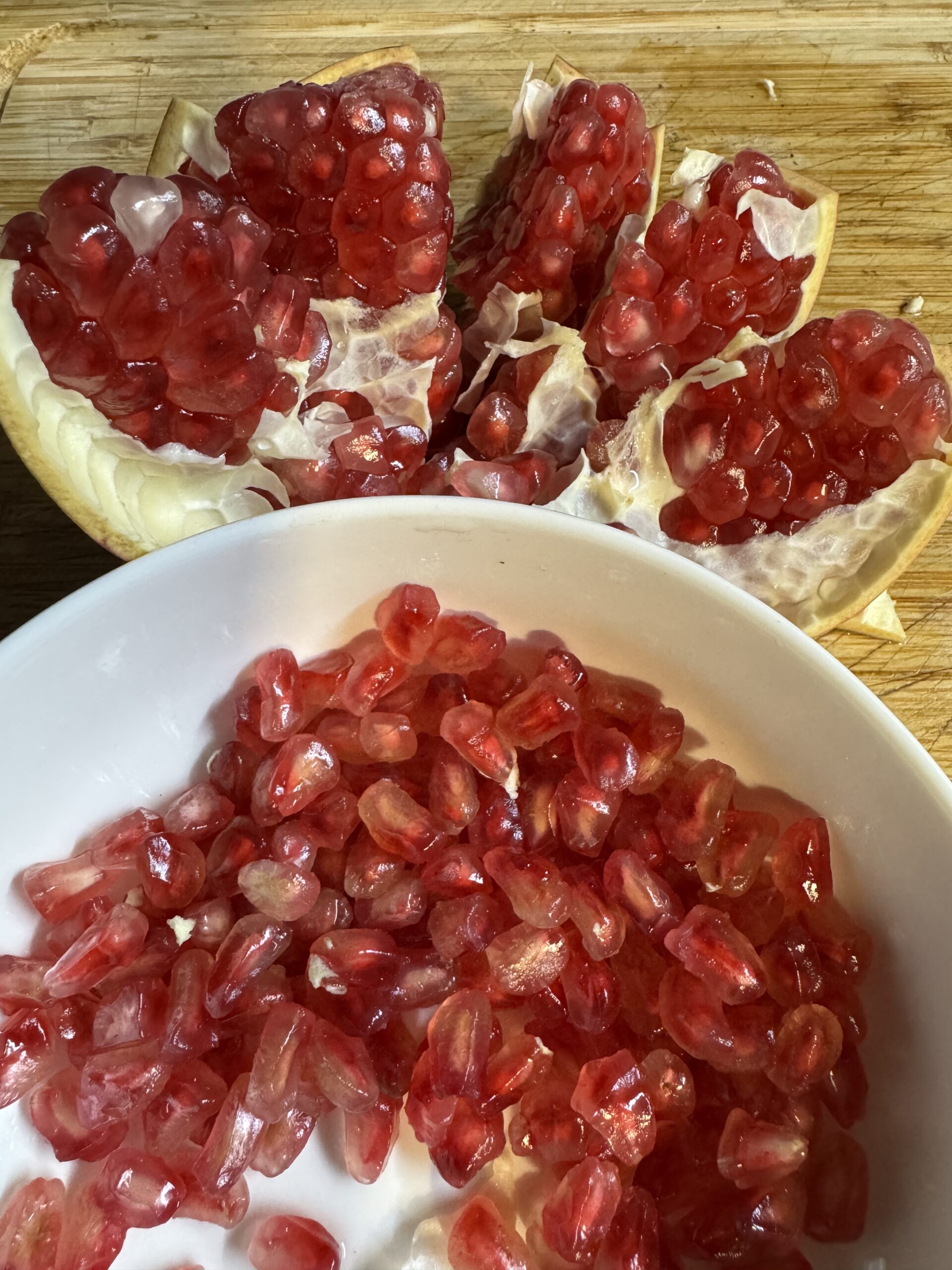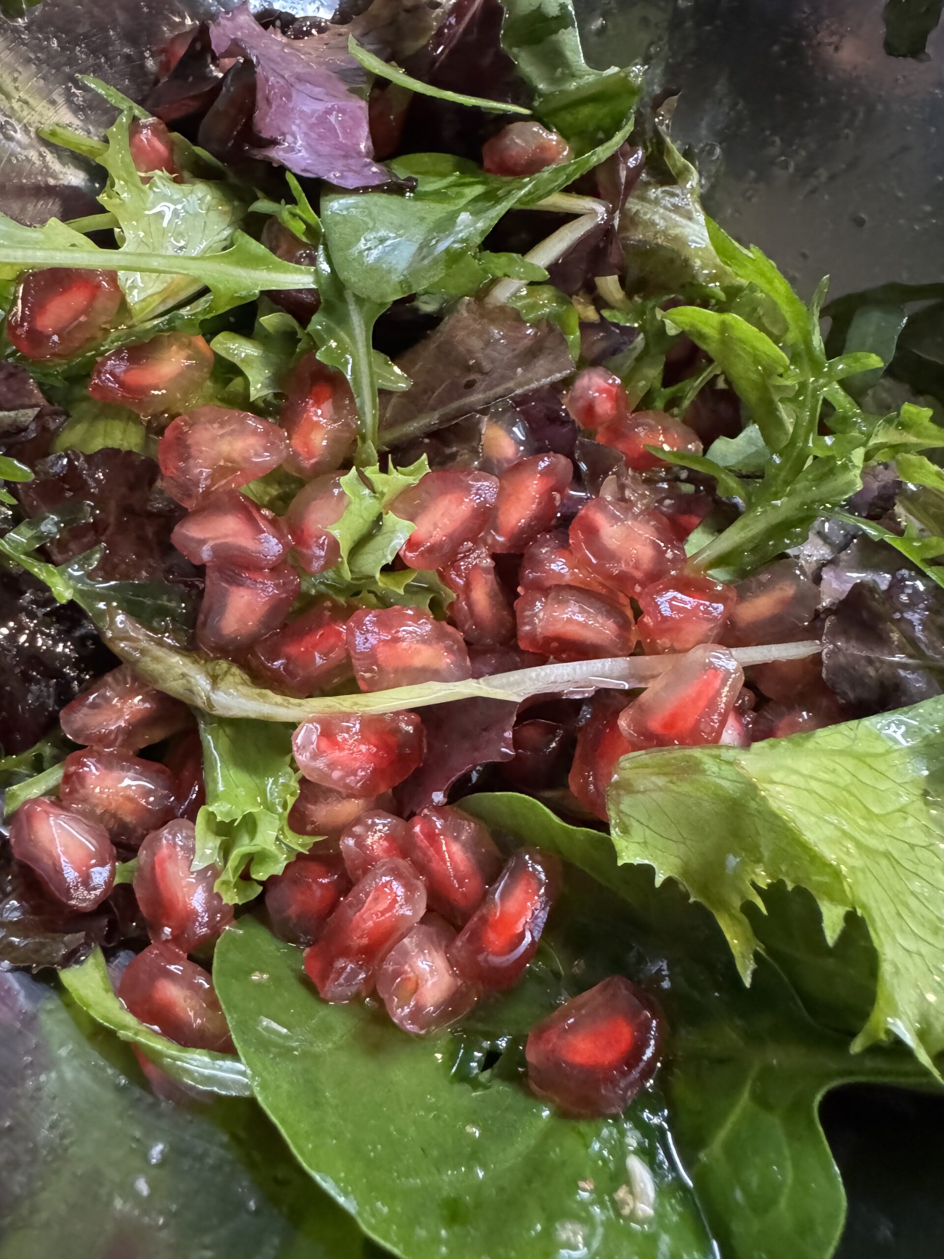 Disfrutemos de lo que nos da la tierra, es maravilloso poder comer de las frutas que nos regala nuestro jardín, tenemos un granado centenario del que podemos disfrutar, todos los días, nos da un regalo en otoño el esplendor con sus frutos, además de hermosos son deliciosos y muy buenos para la salud. En invierno tras perder todas sus hojas, enseña su tronco con toda su fuerza edad y magnificencia, las heridas de la edad las fracturas de las inclemencias del tiempo o las pequeñas hormigas que comen de su interior, es duro es bello y delicado. La primavera aflora las hojas poco a poco se llena cubriéndose de un manto verde a momentos y muy rápidamente empieza a llenarse de topos rojos que al empezar el verano se abren las flores, algunas de ellas al soplar el viento o llover caen según la fragilidad de su naturaleza, las más fuertes aguantan todo el verano y crecen sin parar, son alimento para algunos afortunados pajaros, a veces es irritante pero con el tiempo entiendes que es ley natural, y aquí estamos de nuevo, otoño y hoy toca una exquisita ensalada. Fácil o no , nutre y te saca una sonrisa, que facil, que bella es la vida.