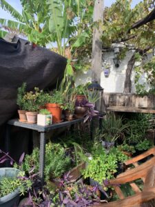 Geranio, palmitos, cactus, margaritas, Lavanda, menta, plantas autóctonas de esta región y otras extranjeras como los Arces Japoneses.