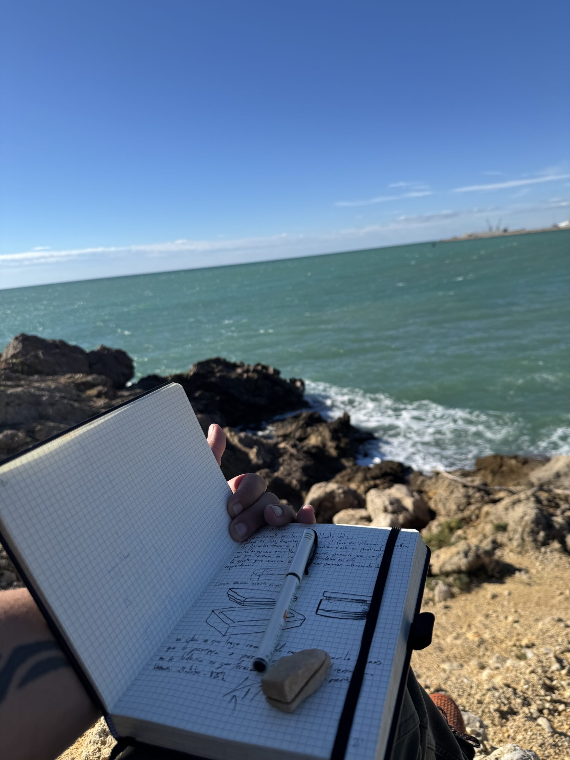 Ayer cuando fui a visitara mi hija, tomé el camino de la playa necesitaba despejar la cabeza, así llegaría tranquilo, mientras caminaba por las rocas una pequeñita me llamó la atención parecía una caja, así que empecé a fijarme en las rocas que había alrededor di la vuelta unos pasos varias veces hasta volver a encontrar esta pequeña piedra. Me dio modo de observar las otras y tomar más atención, el hecho de que hubiese esa grieta en su longitud la vi hermosa y curiosa, así que automáticamente se me ocurre que podía reproducirla en barro, dibujé lo que yo creo que podría ser aproximadamente y técnicamente le preguntaré a mi sensei a ver si estoy cerca con mis ideas o demasiado lejos, quiero decir si es más complicando de lo que yo imagino, pero vamos a verlo mañana. Me siento muy satisfecho con el día de ayer, Ir a ver a mi hija, dando un paseo de 12 kilómetros, parar a dibujar algo inspirado en la naturaleza y describirlo con palabras. Pues me quedaría mucho por escribir, así que mañana más.