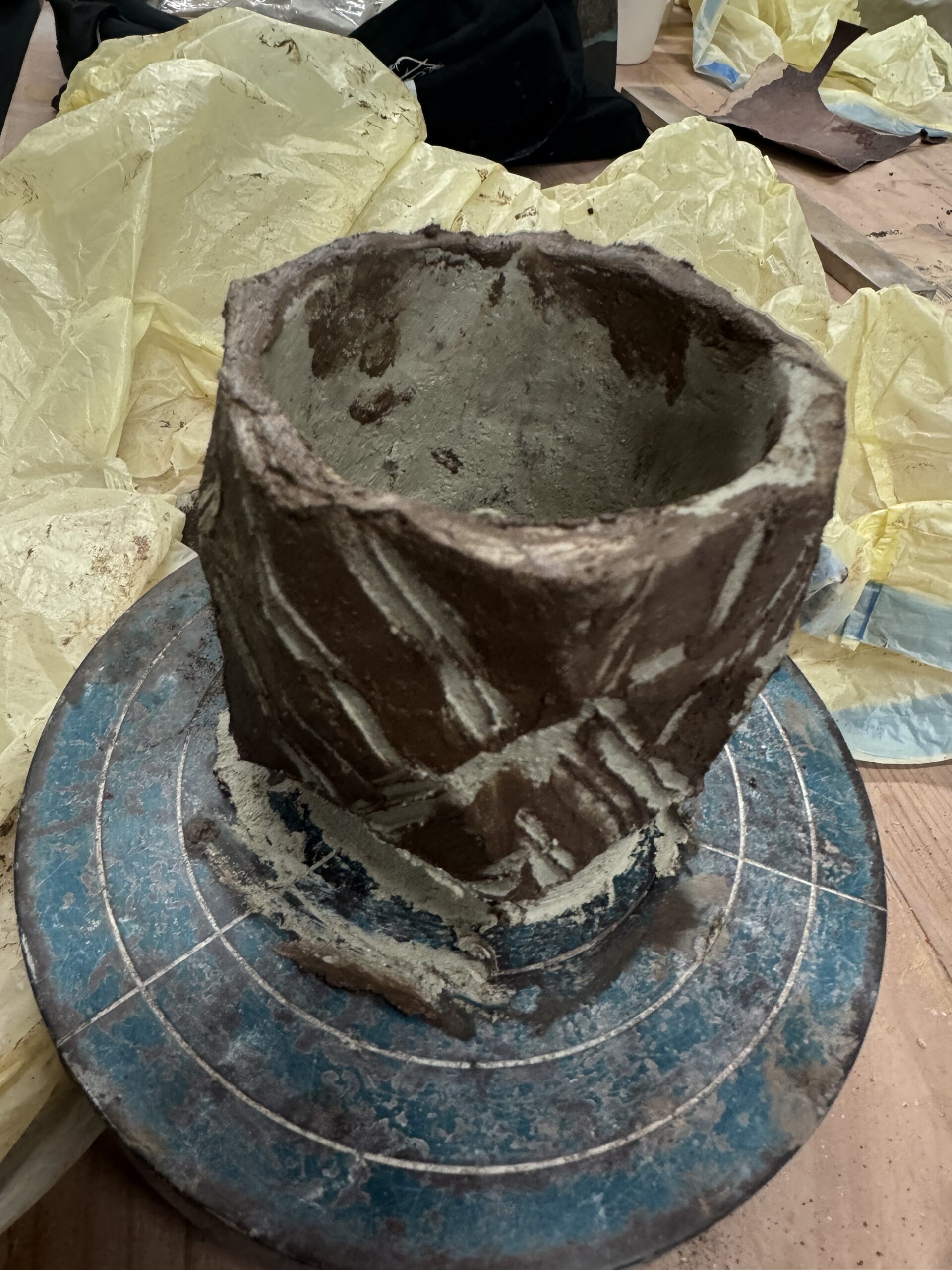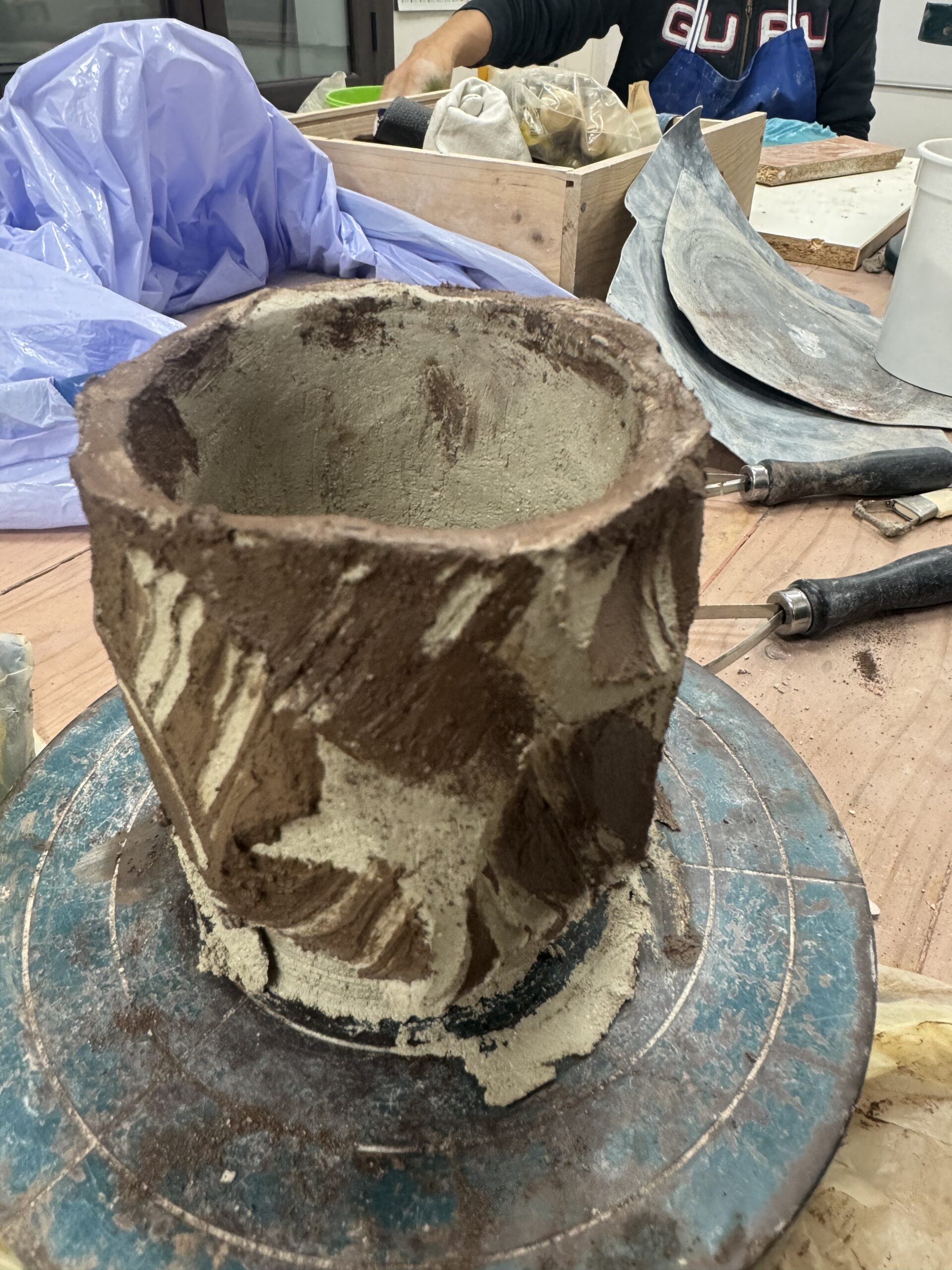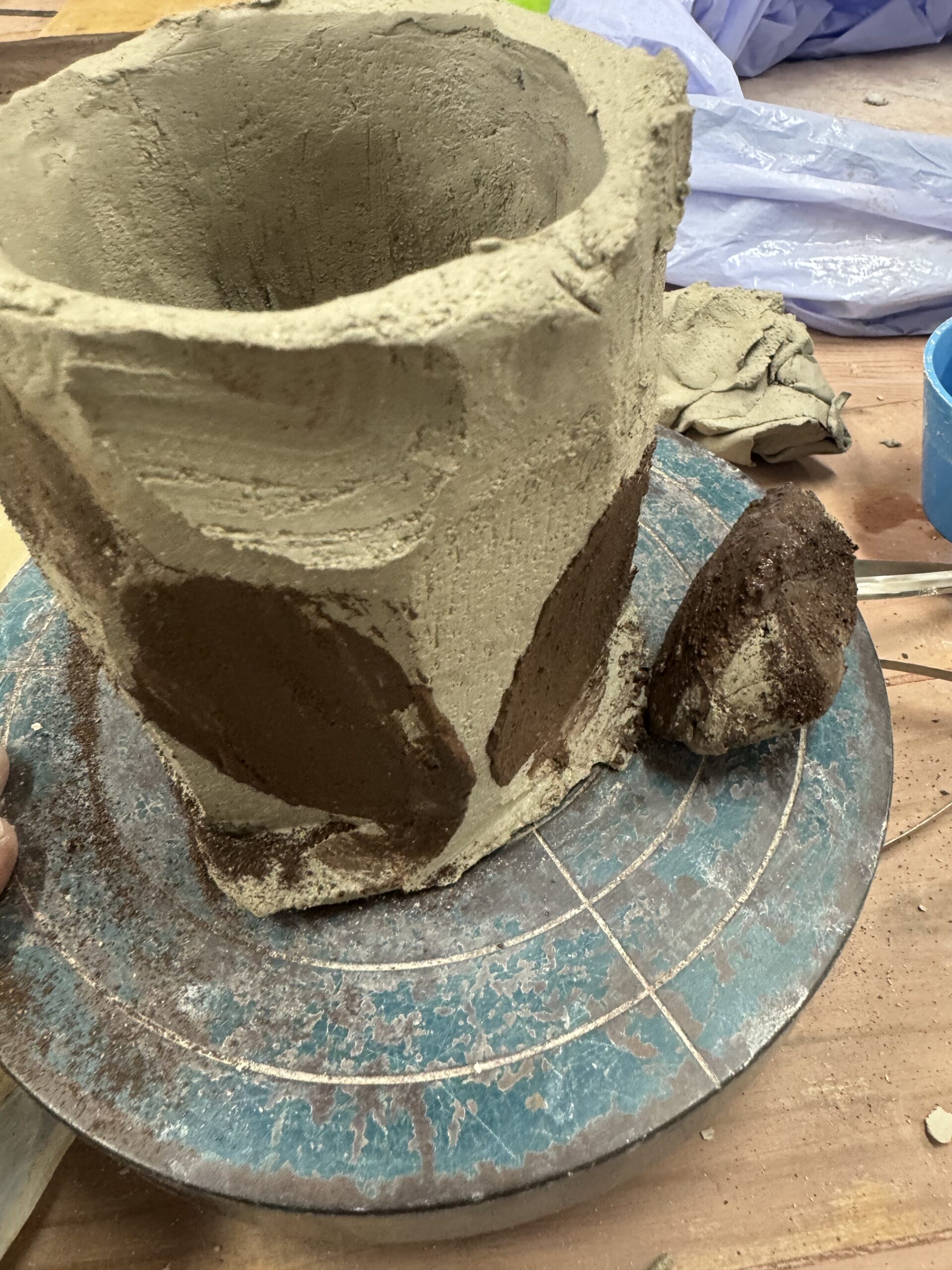 Hoy estuve experimentando con dos arcillas diferentes blanca y negra, es una sensación muy gratificante ver cómo se mezclan las arcillas, cómo salen las formas al cortar con estilo kurinuki, va saliendo la forma final poco a poco, corte a corte, luego se pinta con barro negro para después rascarlo con cuidado y dejar ver el barro blanco a través, es la primera vez que hago algo así, y tengo ganas de ver como queda cuando seque, una compañera me dijo que estaba haciendo algo parecido y que tiene nombre técnico, creo meritage