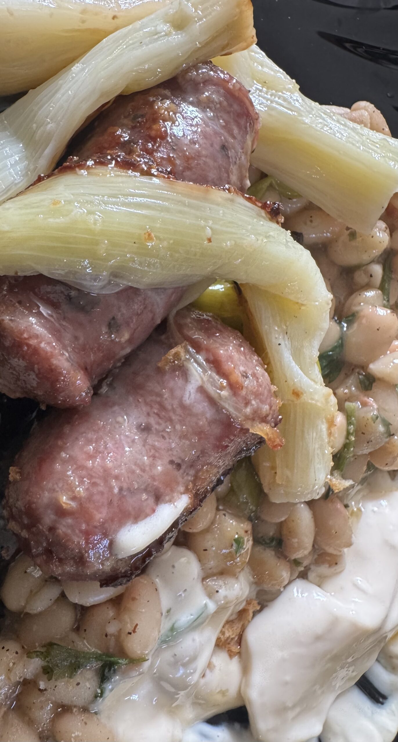 Cociné un plato mixto muy catalán, butifarra con judías blancas y calçots, acompañados de un rico alioli.