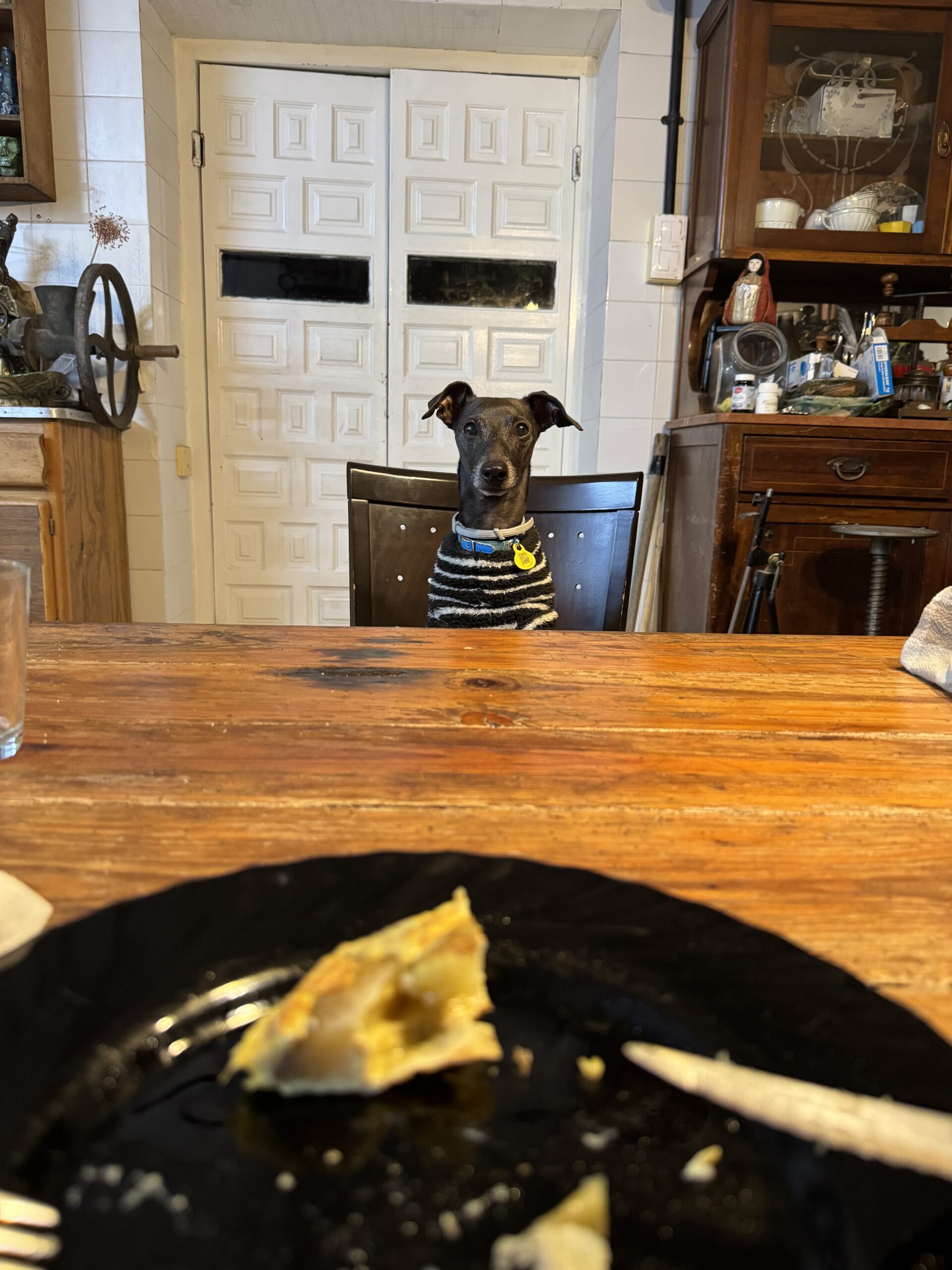 Maluk siempre esperando a que le caiga un poco de comida, elegante se sienta a esperar, fácilmente ocupando mi lugar. Así le hace compañía a Vane, cuando dejo mi sitio en la mesa libre.