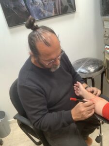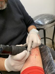 Después de comer Ethan me ha dicho sentarme en la mesa para grabar como escribo la carta que entregaré a Luis con las cosas que quiero que represente en el tattoo. Luego me ha dicho que fuera al estudio de Luis porque tenia que grabar dibujando en mi piel. Y cuando Luis ha terminado de dibujar ha dicho: ahora hay que terminar el trabajo.