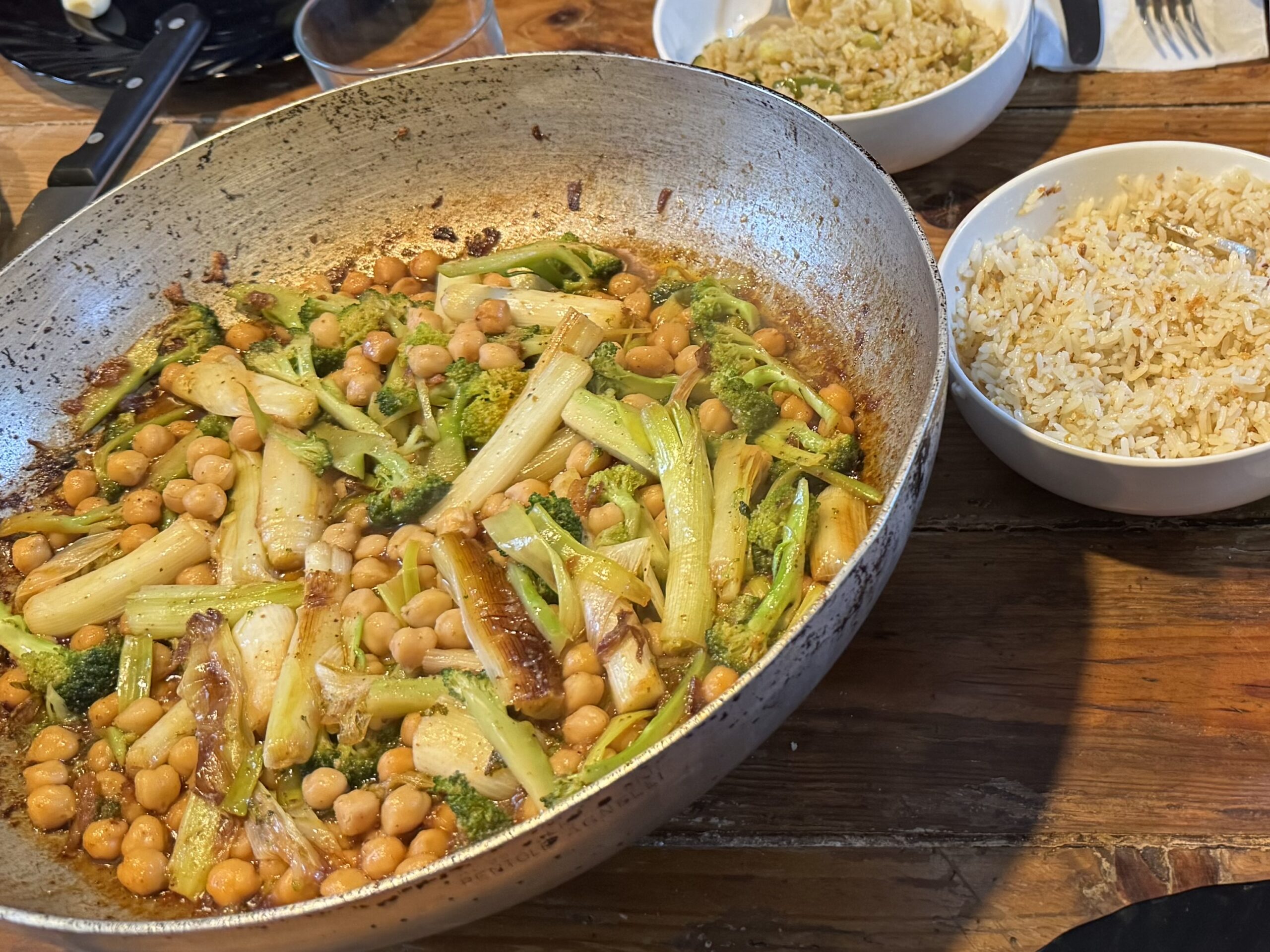 Cocine un rico plato vegano con garbanzos, brócoli y calçots, un poquito de arroz blanco con sésamo y ajo, y quedamos todos felices, estaba riquísimo.