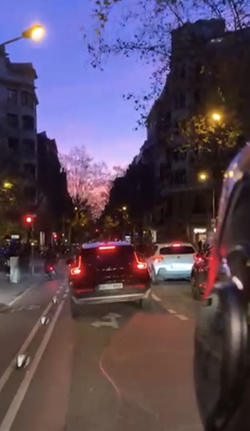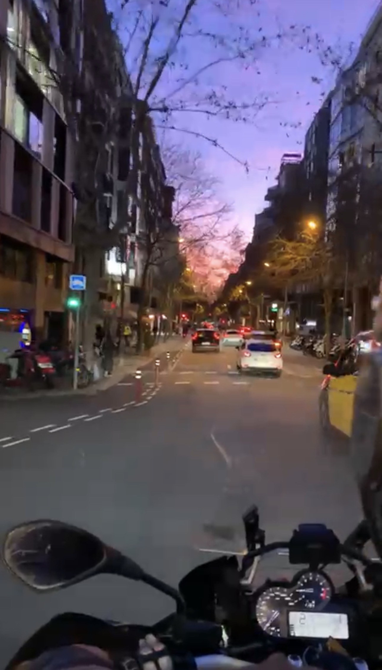 Al volver la puesta de sol nos pilló en el centro de Barcelona, entre edificios y el tráfico, las luces el cielo pintado entre azul y otros mil tonalidades entre rojos, rosas morados y anaranjado, chispitas doradas que dan las farolas en el camino.