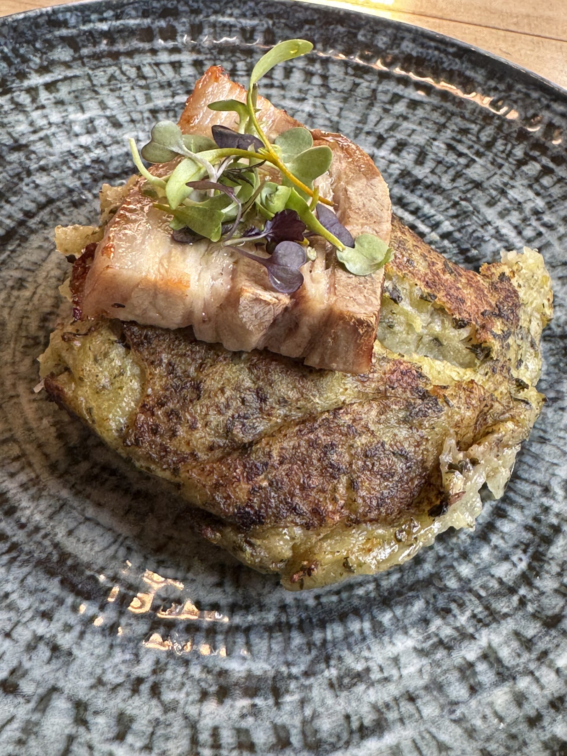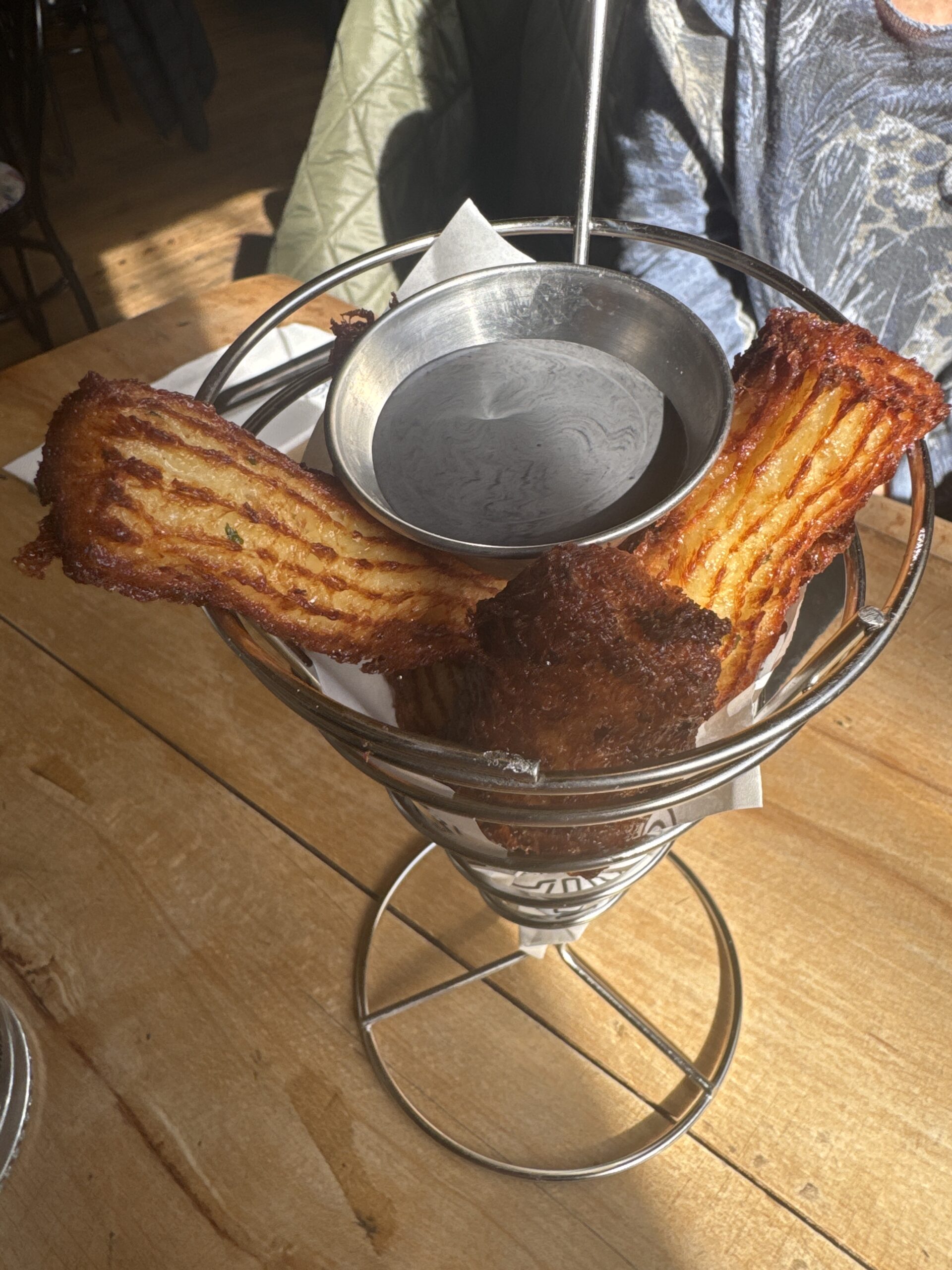 Hace un día fabuloso, comemos junto a la ventana de un restaurante, además la comida muy buena, compartimos unos “churros” de bacalao y comimos Una dorada, un trinxat de la Cerdaña y una butifarra con judías, de esta no hice foto. Un arroz con leche y una pizca de canela para Vane y un café y ya lo tenemos.