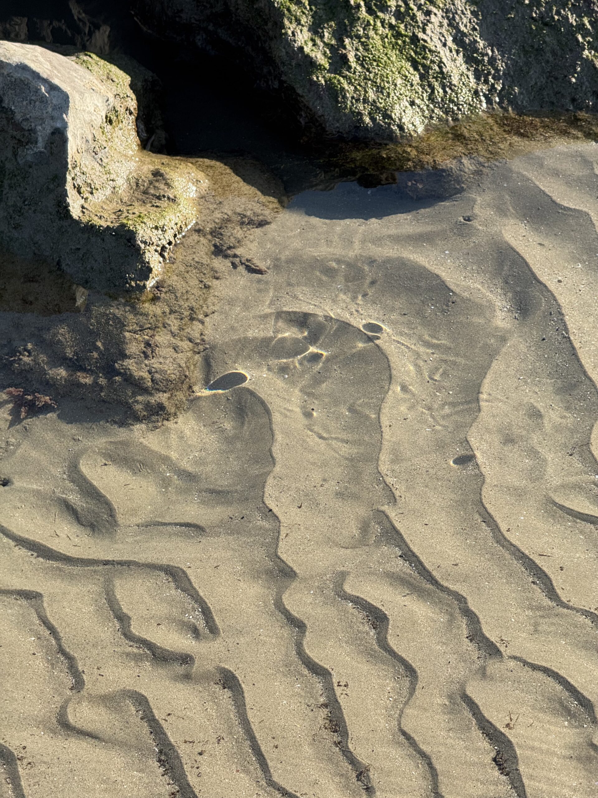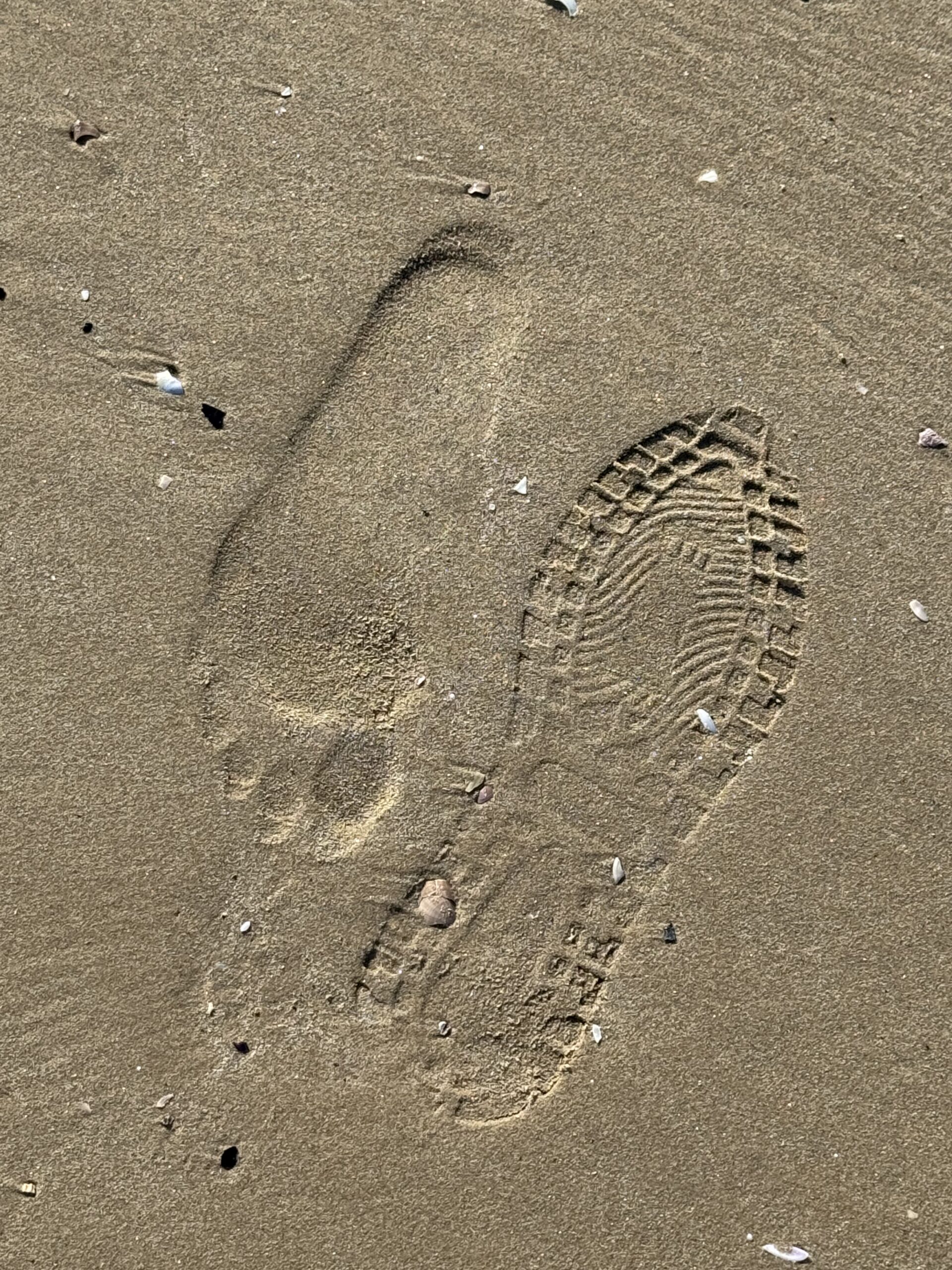 Paseamos, recogí conchas, vi arte efímero, como unas pisadas que te hacen pensar. Descalzo o calzado? Podría ser un dilema, pero para mí depende solo el momento. conectar? descalzo, pasear calzado.