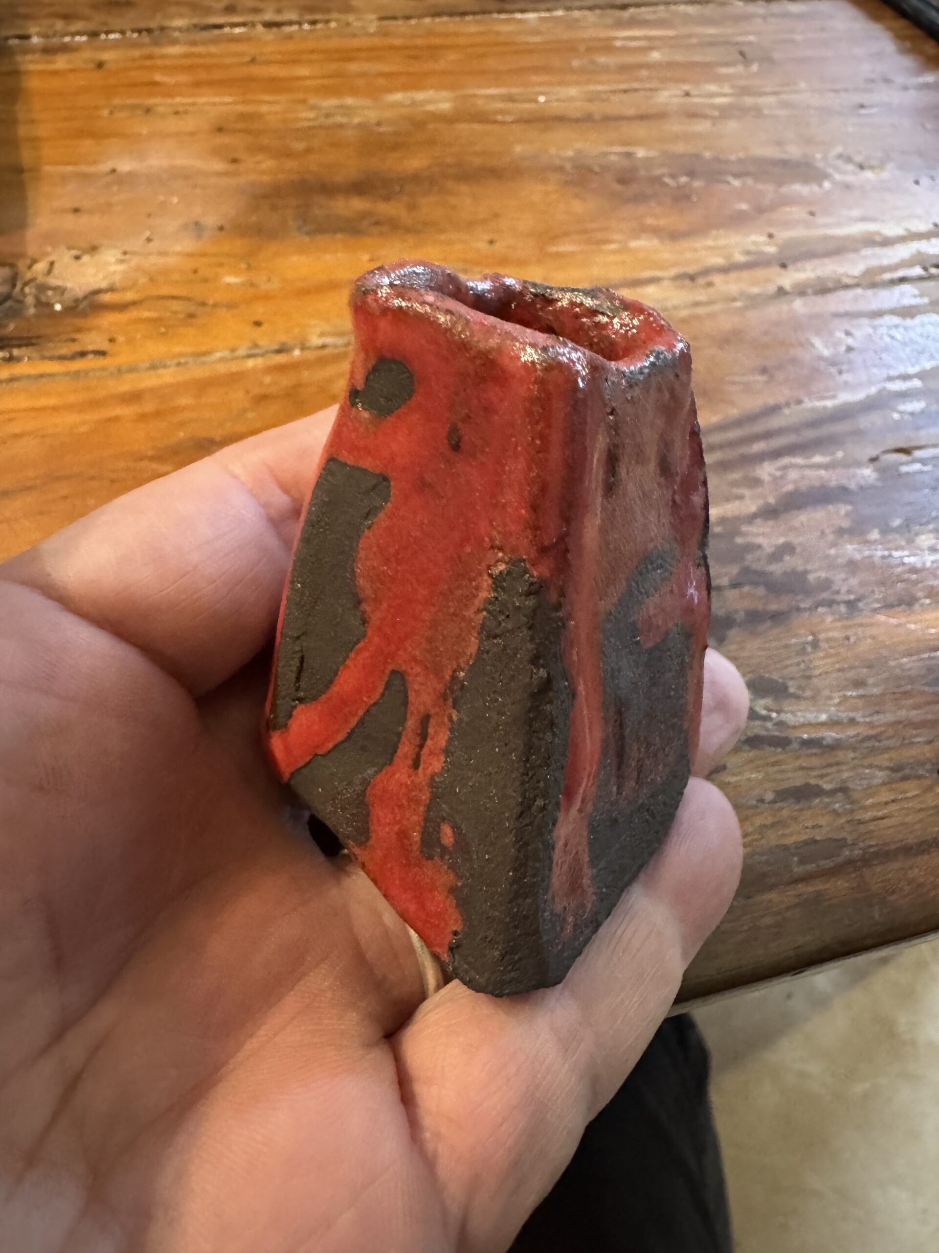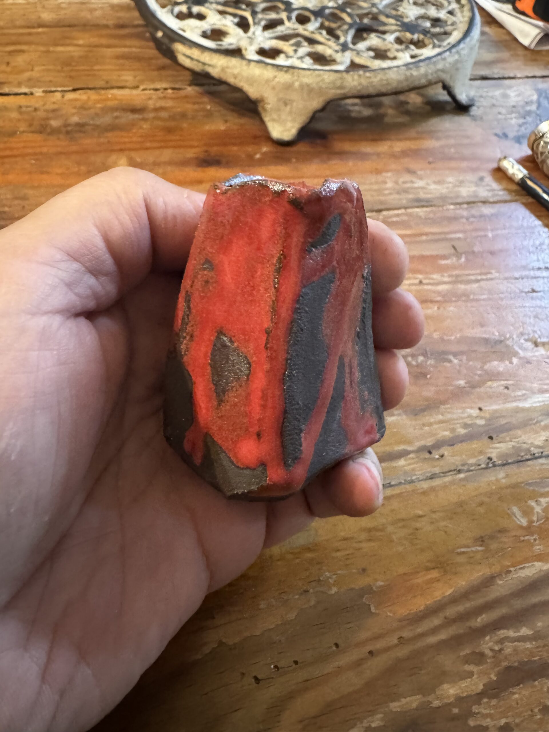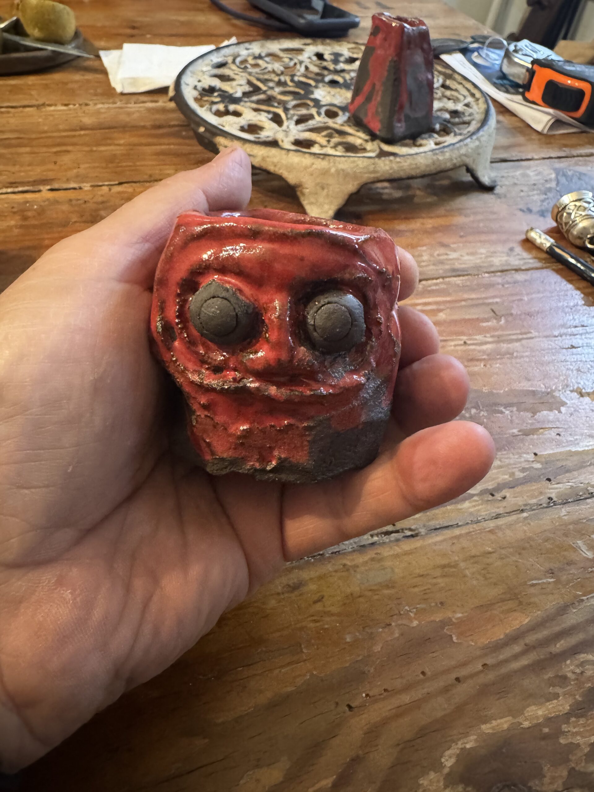 Por la tarde sesión de cerámica, estuve haciendo experimentos con los esmaltes. Veremos que tal quedan, la semana que viene. Hoy pude recojer dos pequeños experimentos que hice hace 2 semanas, y me encantó que Vane dijese “parece un volcán” así que mi barrita para soja, abra que añadirle picante, y mi little daruma, me dice tómatelo con más calma.