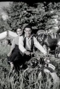Ellos son míos tíos abuelos, Rosario y Ataúlfo. Mi tío conduce la moto de mi abuelo, un modelo Lube con el cambio en el depósito. Eran tan jóvenes que aún no tenían hijos. Mi madre me explica que en esa época pocas mujeres se subían en una moto, que como llevaban falda larga tenían que sentarse de lado con las piernas colgando. Pero mi tía sí que se subía porque era muy divertida. Dice que se disfrazaba en los Carnavales que siempre hacía bromas y que si se bebía una copa de vino, era Todavia más divertida. Creo que me parezco mucho a ella. Ya de mayor, la recuerdo cn el pelo totalmente blanco y la mirada cariñosa. Mi tio se reía mucho también. Cuando le presenté a Luis, le dije: tio te presento a mi chico. Y desde entonces siempre le preguntaba a mi madre por mi y mi chico. Hahahhaha. Los dos murieron hace unos años, pero les tengo mucho cariño todavía. Podría dibujar sus caras sin problemas, los recuerdo perfectamente. Mi familia es de Castilla la Mancha muy cerca de donde sucede parte de la historia de Èl Quijote de La Mancha. El pueblo de Dulcinea, que es la querida de Don Quijote está a solo 40 minutos en coche y se llama El Toboso. Y tambien està muy cerca Mora del Curvo con sus molinos en lo alto de una colina, los cuales Don Quijote pensaba eran gigantes que querían matarlo. La Mancha es muy bonita pero es de interior y la vida allí pasa más despacio.