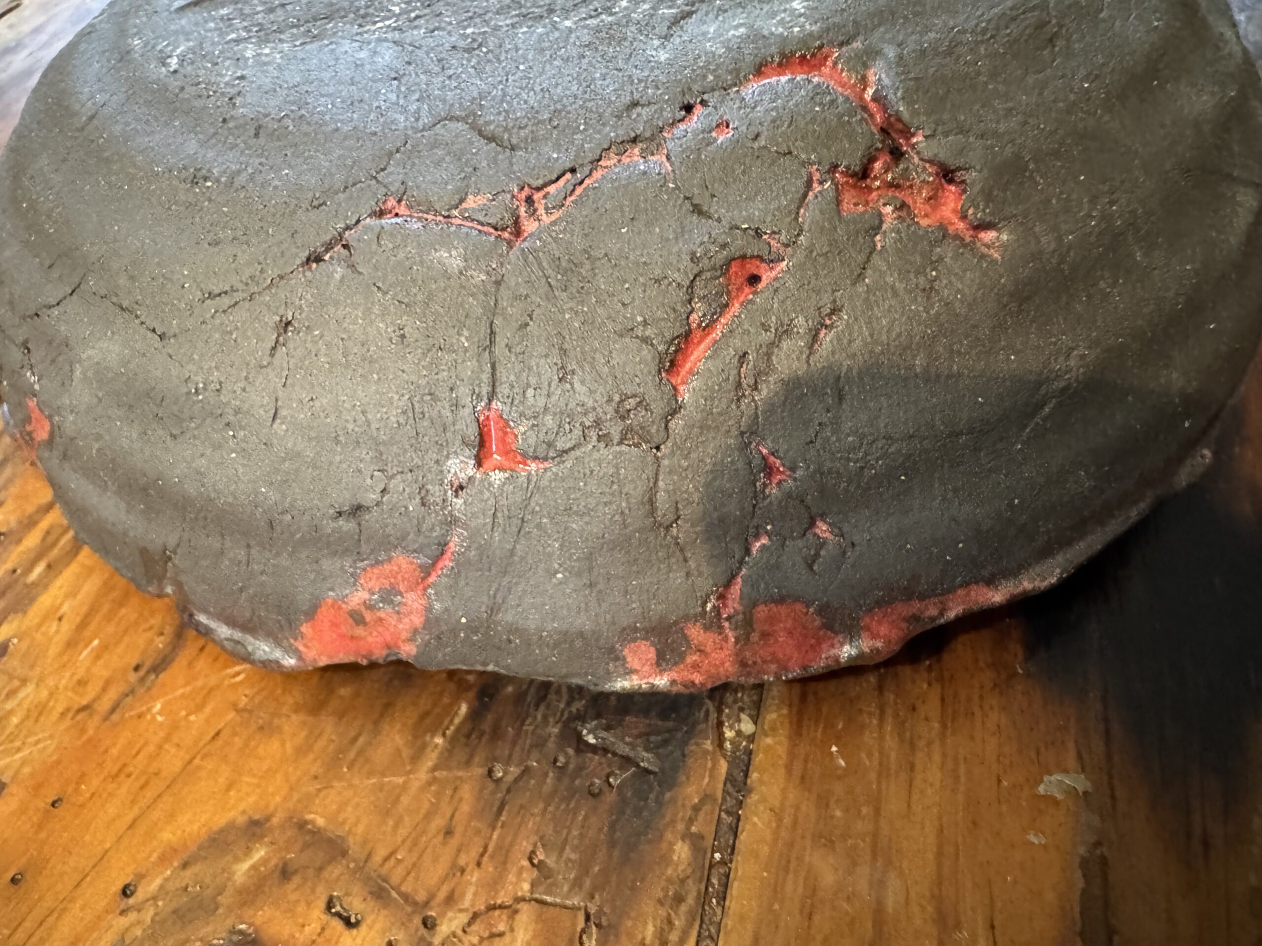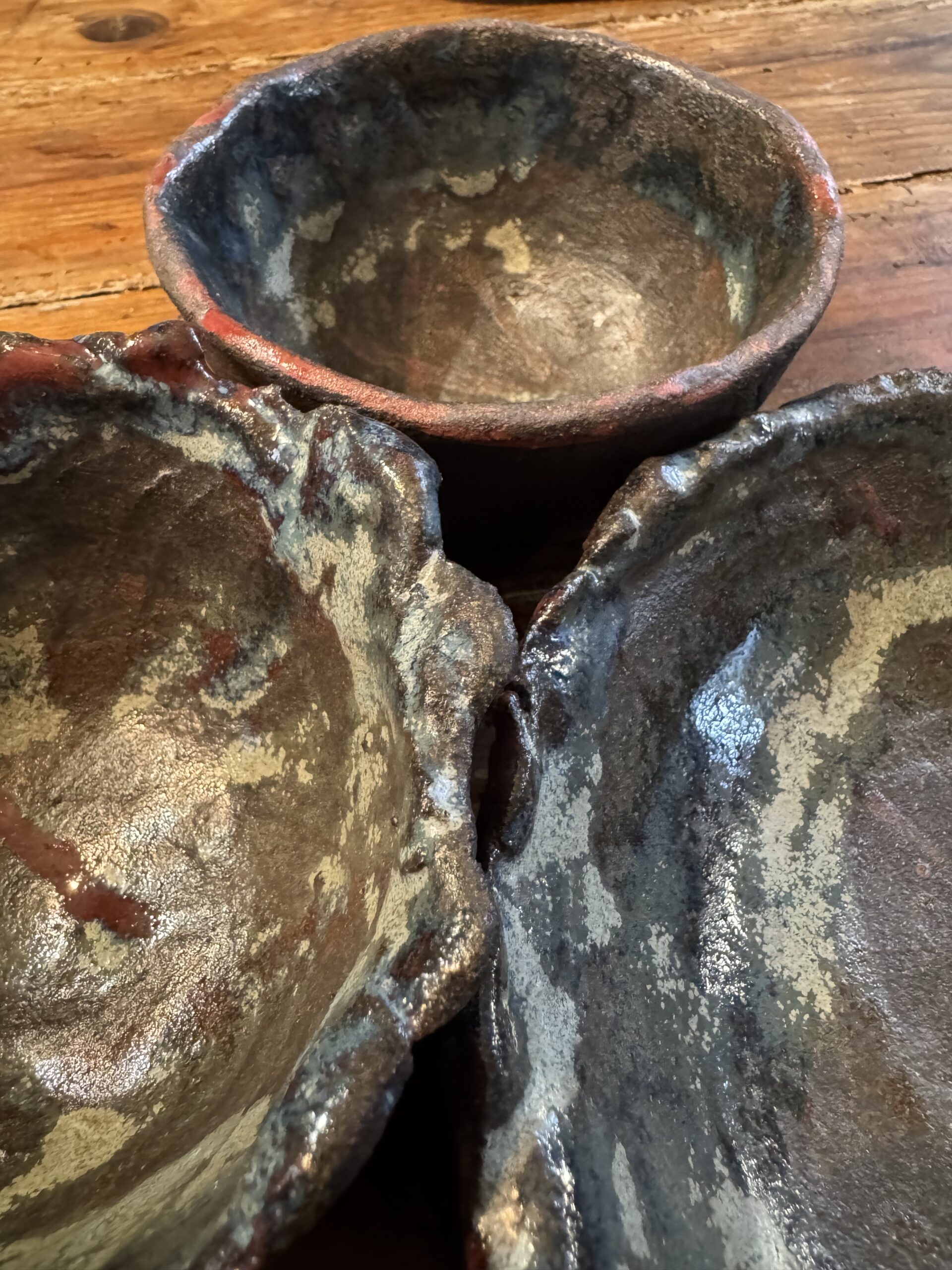 Ayer traje unos platos, hoy les dediqué un rato, los miré y observé paré a hacerles unas fotos, me gusta como queda el rojo en las grietas, decidí ponerles esmalte en vez de retocarlas y alisarlas, la “imperfección” es bella.