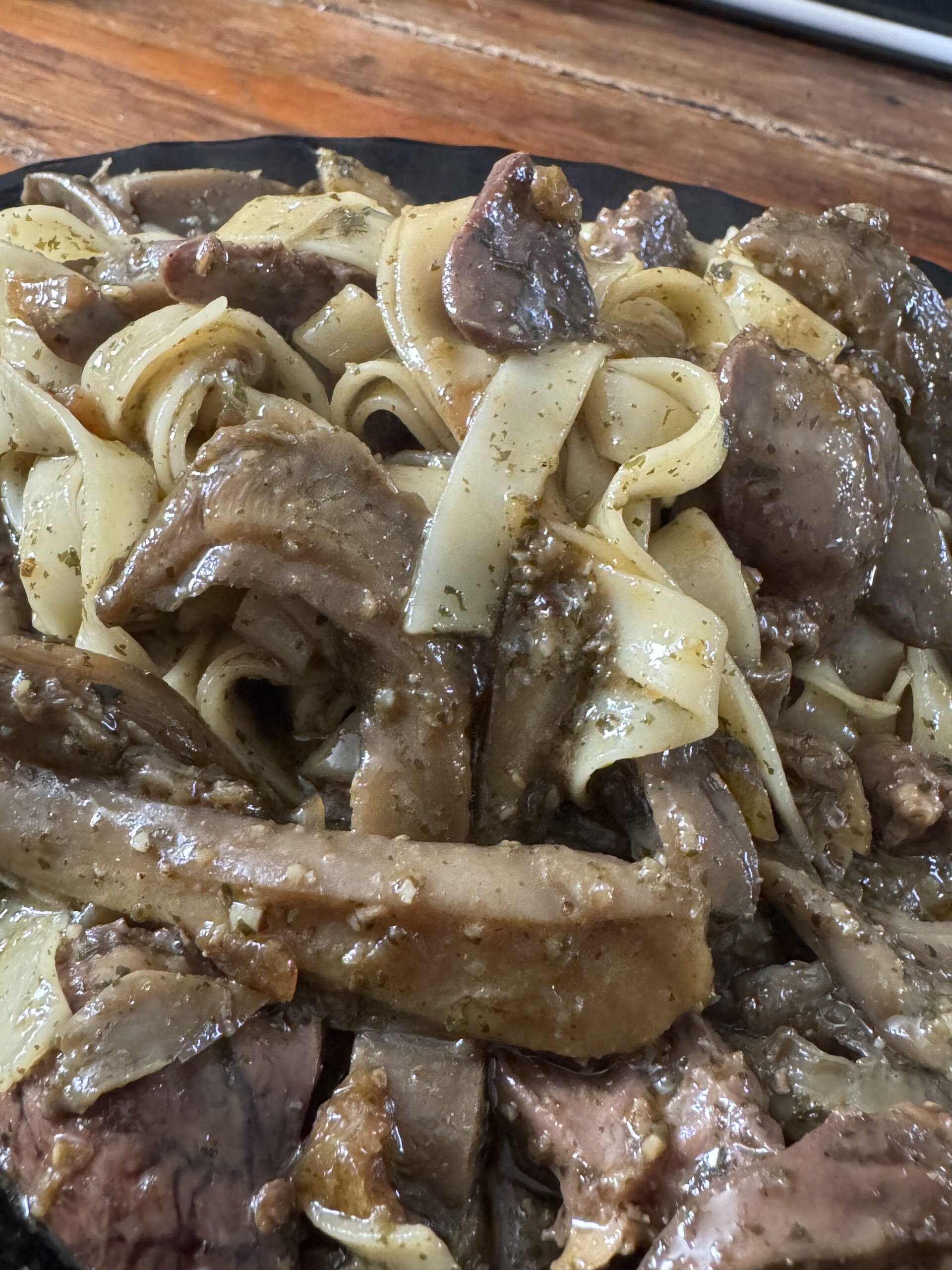 Volví a casa con hambre pero tuve paciencia y me hice algo especial para comer, hígados y corazones de pollo y una setas lo mezcle con unos tallarines chinos y a disfrutar.