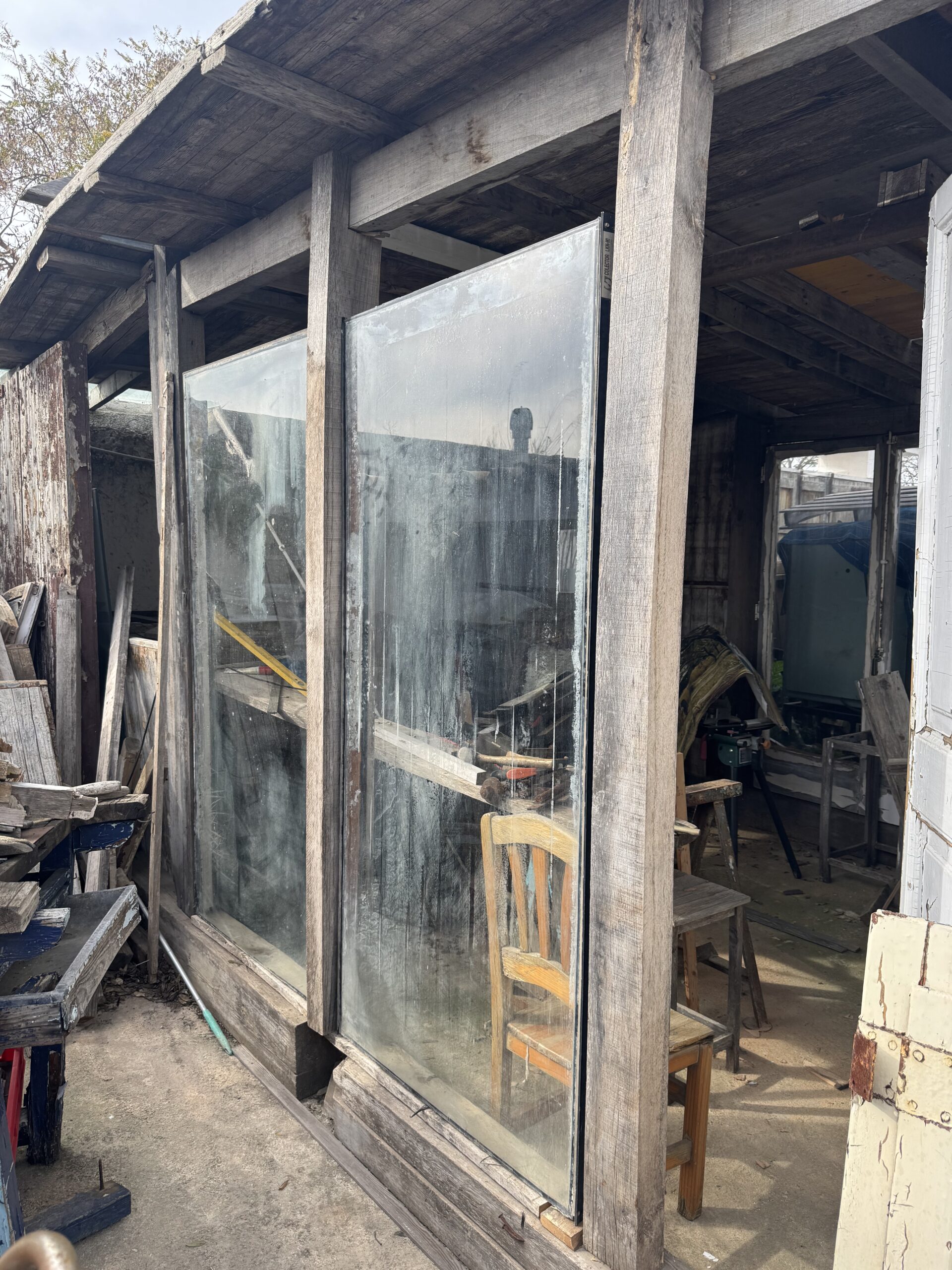 Los cristales que estoy usando, los encontré en el contenedor en frente a casa, creo son de unas placas solares desmontadas. Pero para mí son paredes, debo encontrar la manera para eliminar la cal y el desgaste por el sol, para que queden más limpios, Reciclar es fantástico. Cambiar una madera de sitio para hacer un divisor, entre vidrios me parecía buena idea, hasta que tuve que volver a encajar todas las medidas, que locura, pero se ve mejor, por lo menos para mis ojos. Mañana seguramente seguiré, ya que por poco que sea, lo que hago en el patio como es utilizando cosas que están por ahí, se va despejando y poniendo en orden poco a poco.
