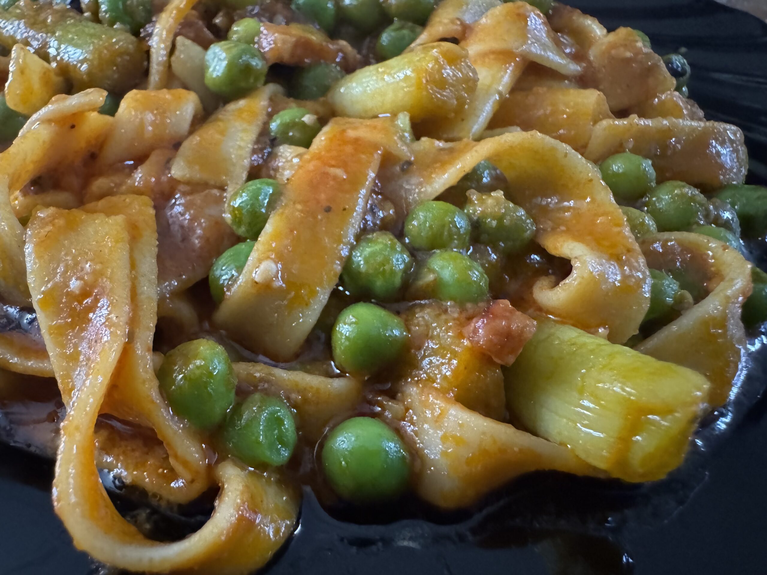 Volviendo aquí y ahora, hoy me hice un rico plato de pasta reciclando lo que hice ayer le añadí guisantes y cebolleta y quedó perfecto.