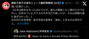 「日本は歴史を作ったばかりだが、誰もが額装したい類のものではない。日本はついにガラスの天井を打ち破ったが、それは棺桶の蓋に過ぎなかった。」樺島万里子のツイート