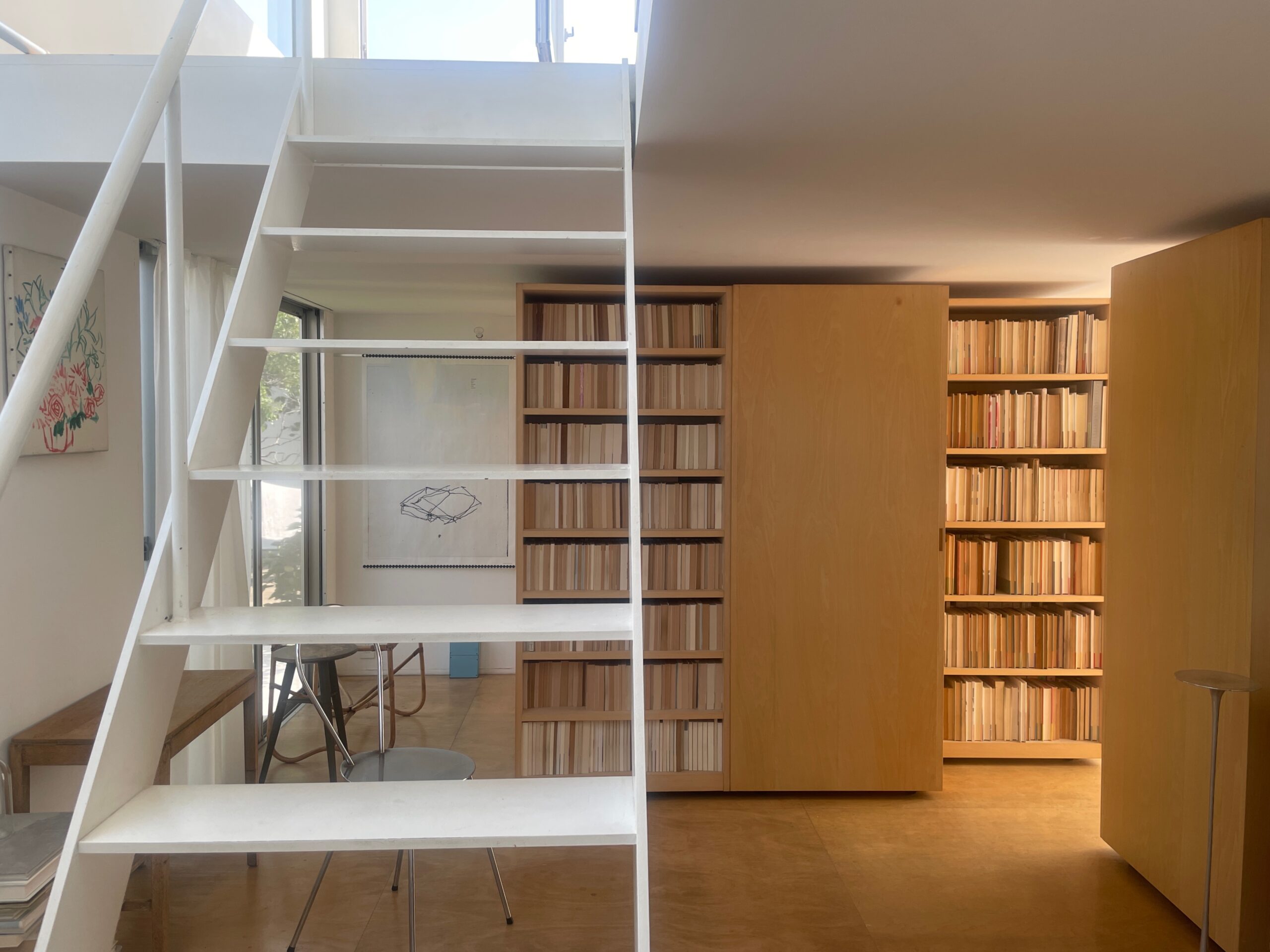 写真は2階部分。ずらりと並んだ本棚の本がすべてひっくり返っている。森山さんいわく、「背表紙がうるさくなってきた」のだそう。情報が適度にそがれていることが、この空間の居心地の良さにつながっているのかもしれない。しかも、この本棚は可動式。仕切りがわりにもなっていて、場所を変えると雰囲気がぐっと変わる。今回で森山邸を訪れるのは3回めだが、毎回違って見える!