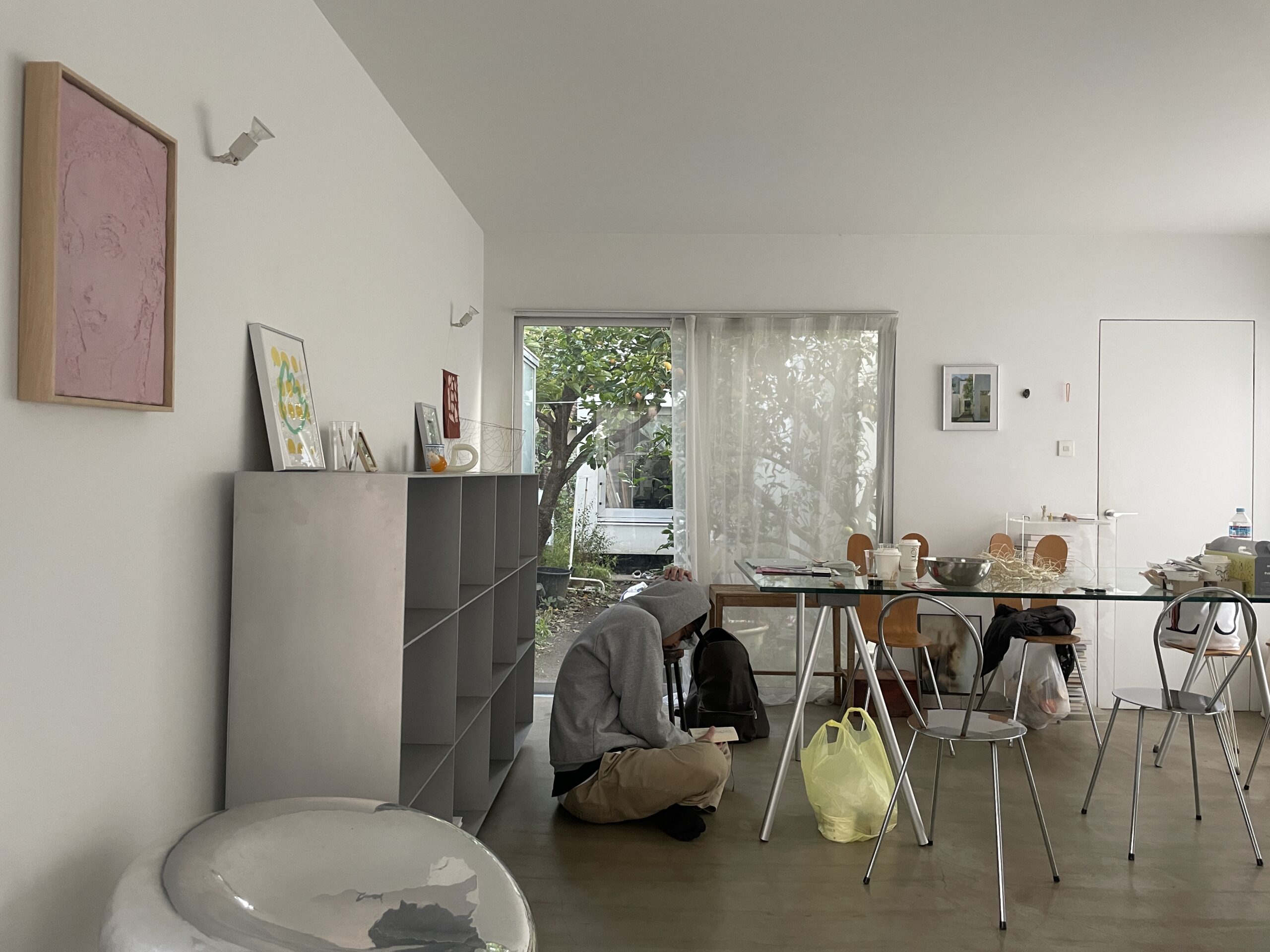 初日と最終日に設営と撤去を手伝ってくれる予定だった迎も、結局のところ、来る予定のなかった2日目も含めて全日もりやまていに来ていた。なんで来ることにしたん?って聞いたら「ここで日常をやろうと思って」との返事。床に座り込んで本を読んだり、ソファでサッカーゲームをして思い思いに過ごしていた。(074)