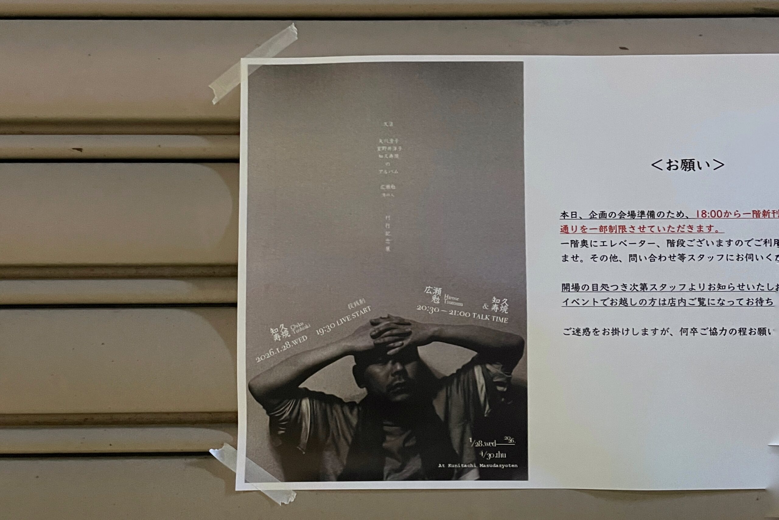 国立・増田書店にて、写真集『天沼 矢川澄子・室野井洋子・知久寿焼のアルバム』(広瀬勉/港の人刊)刊行記念展が開催されている。開催初日の28日に、知久寿焼さんのライブがあるというので行ってきた。素晴らしかった。わたしは気がついていなかったのだが知久さんは『さよなら人類』で知られる「たま」のメンバーだった人だった!言われてみたら…特徴的な声が一緒だった!ライブの最後のほうに歌っていた「月がみてたよ(Overstay)」という歌がすごくよかった。増田書店に出会わなかったら知らなかったものがたくさんあるな。