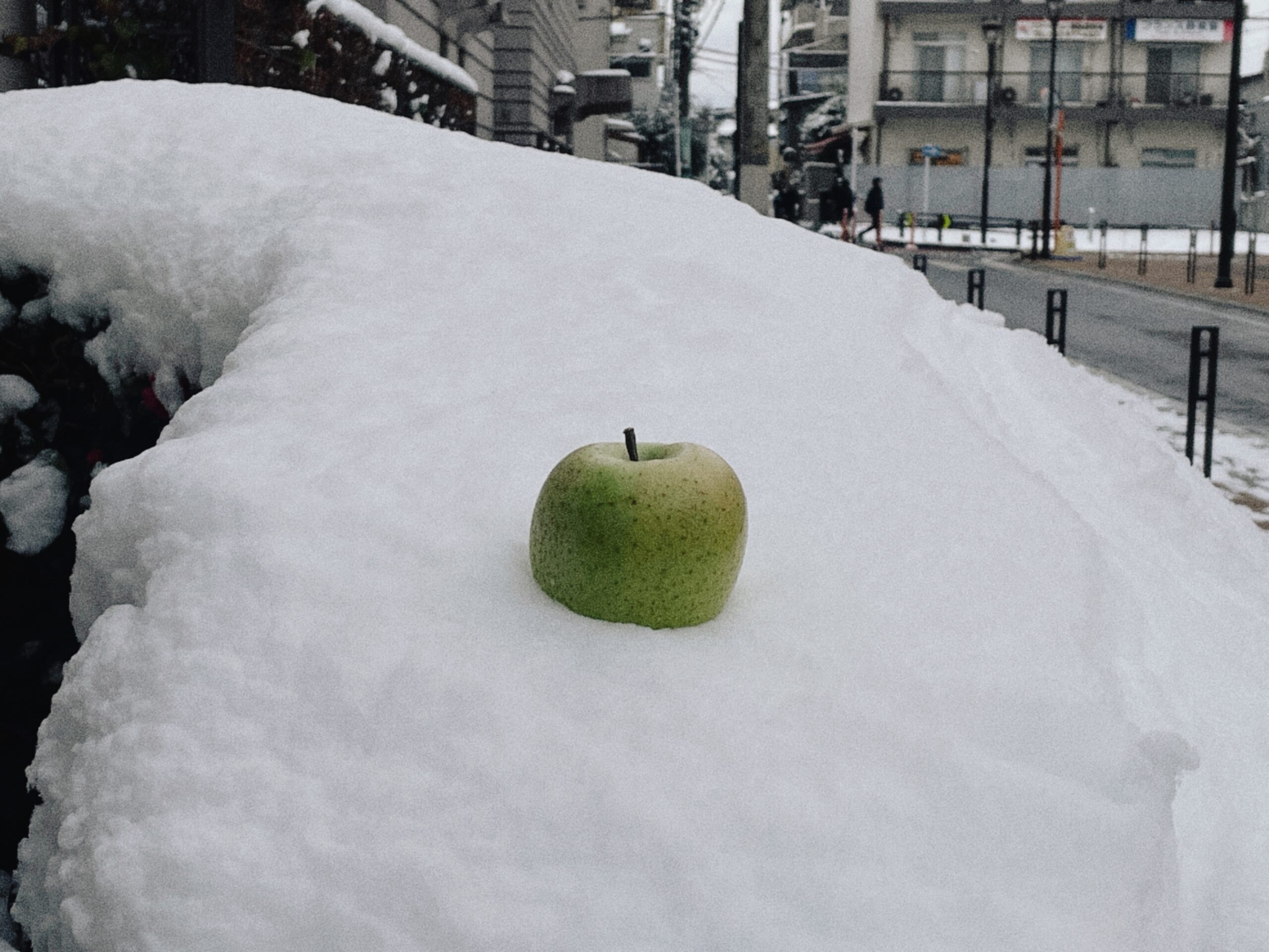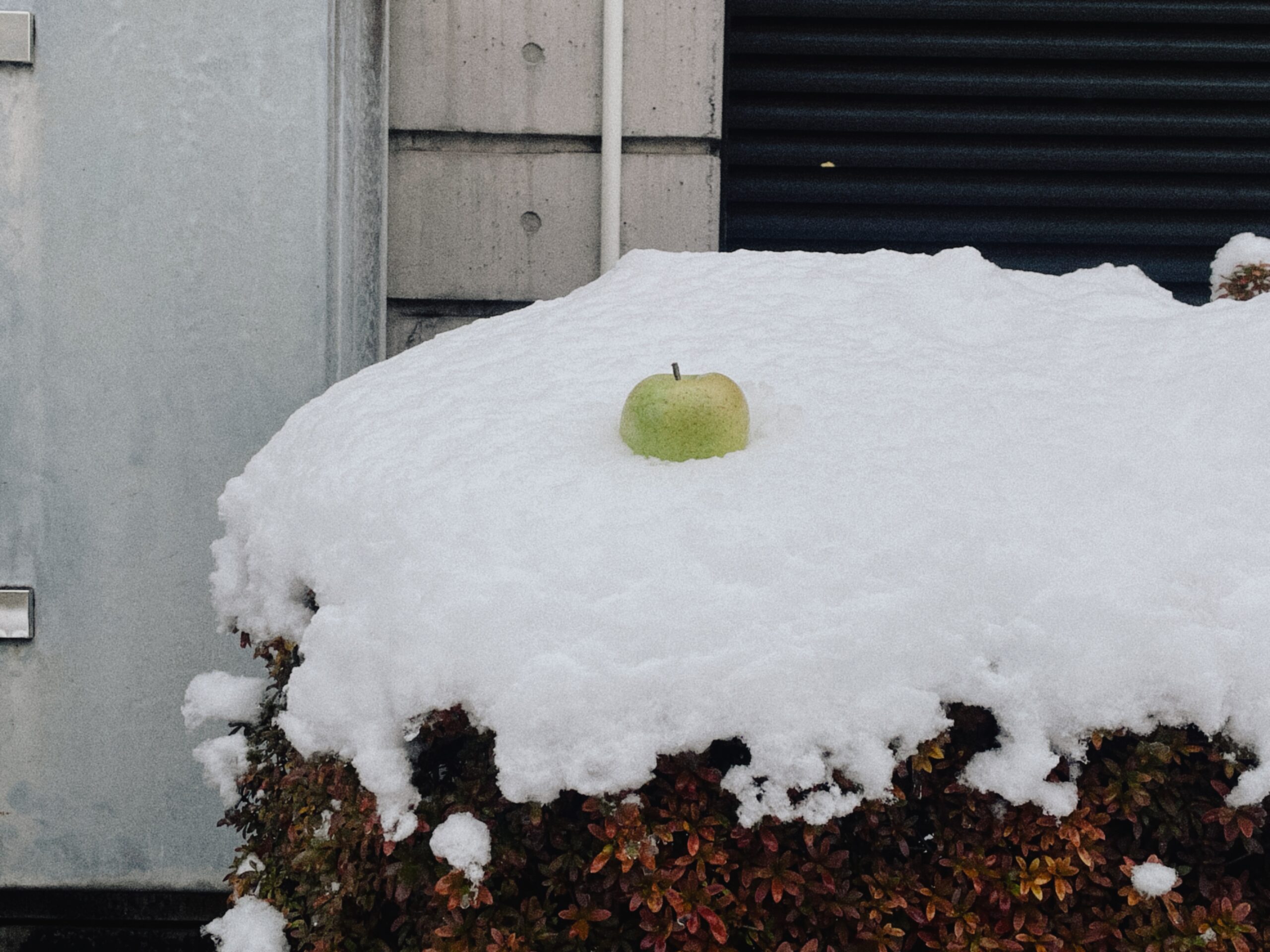 14時前になってようやく家をでる。手には青りんご。どうしても雪の上にのっけてみたくて手に持って出る。