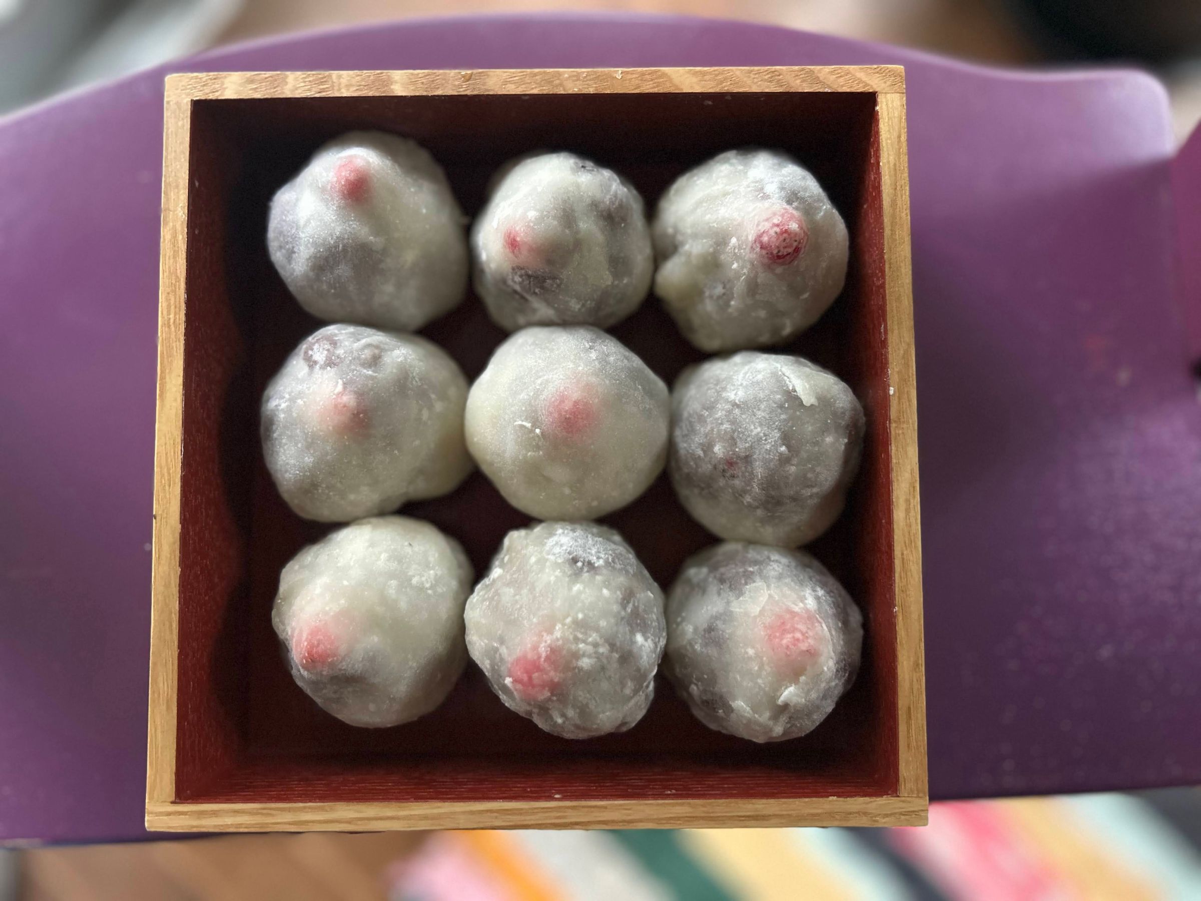 お重一杯に苺大福を作った、長女が大好きな苺に、こしあんをたっぷり包んで、求肥でくるむ。いつもよりは大きな苺買ってきたから美味しいはずー
