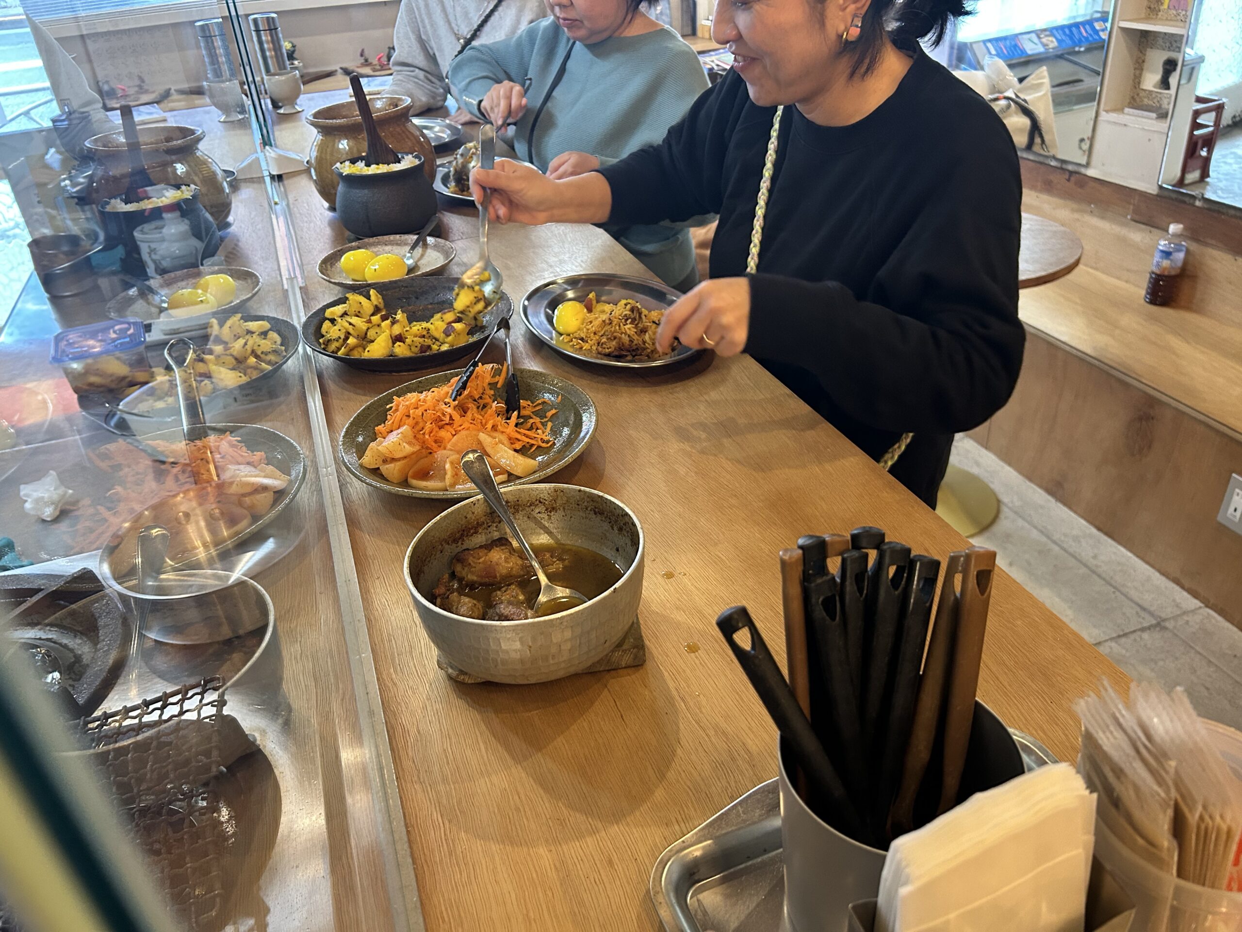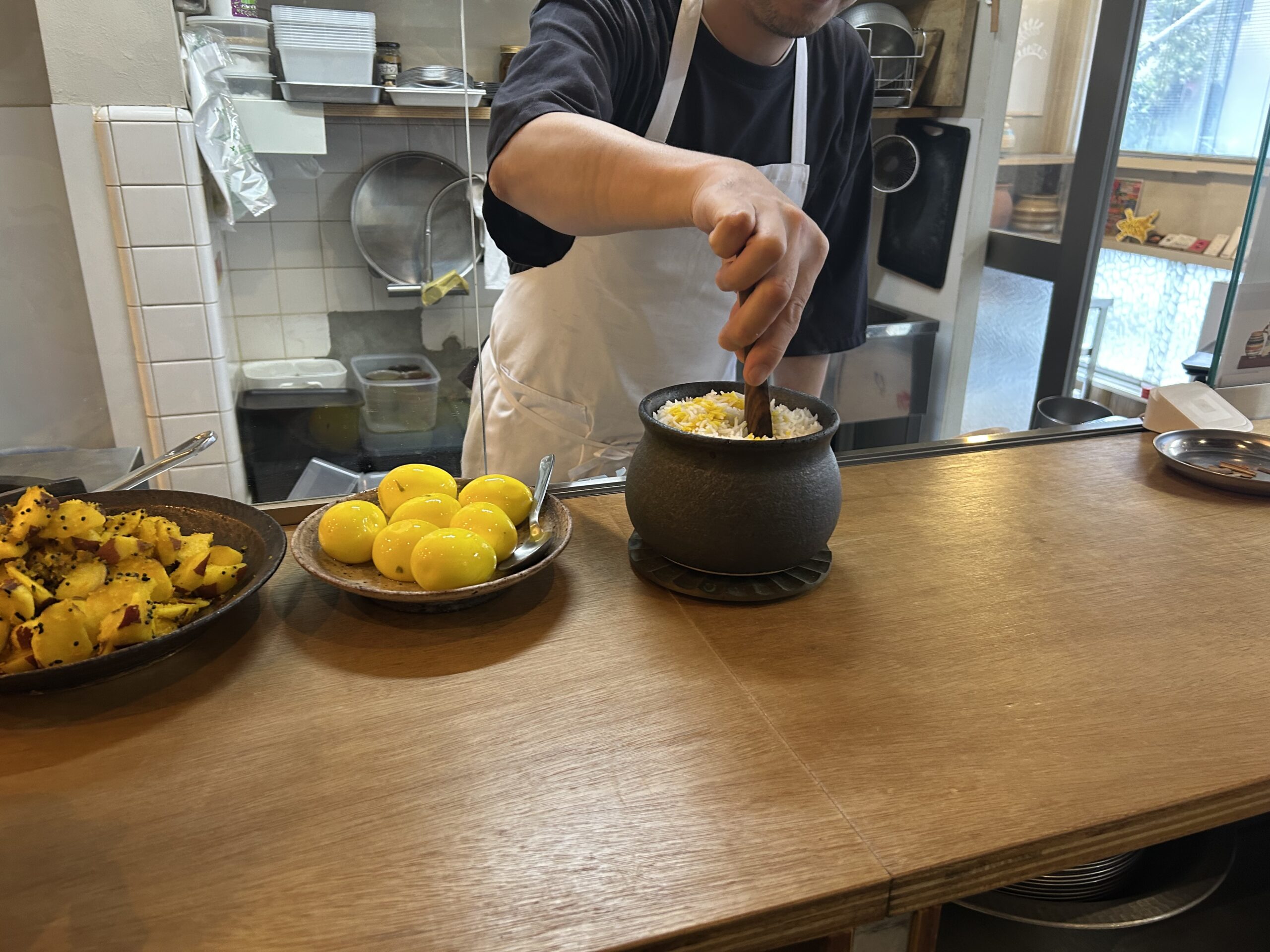 ふっくらバスマティライスを口に入れるとスパイスが口の中に広がって、美味しいー!付け合わせの副菜も絶品で…たまらん!