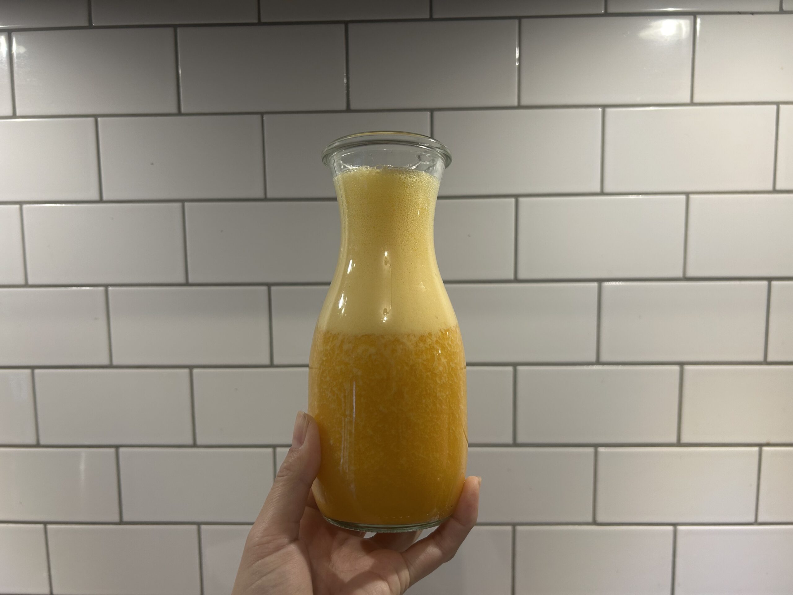 皮を剥いて丸ごと、バイタミックスに投入するとあっという間にミカンジュースが出来上がり!ビタミンCたっぷり、この時期だけのお楽しみです。