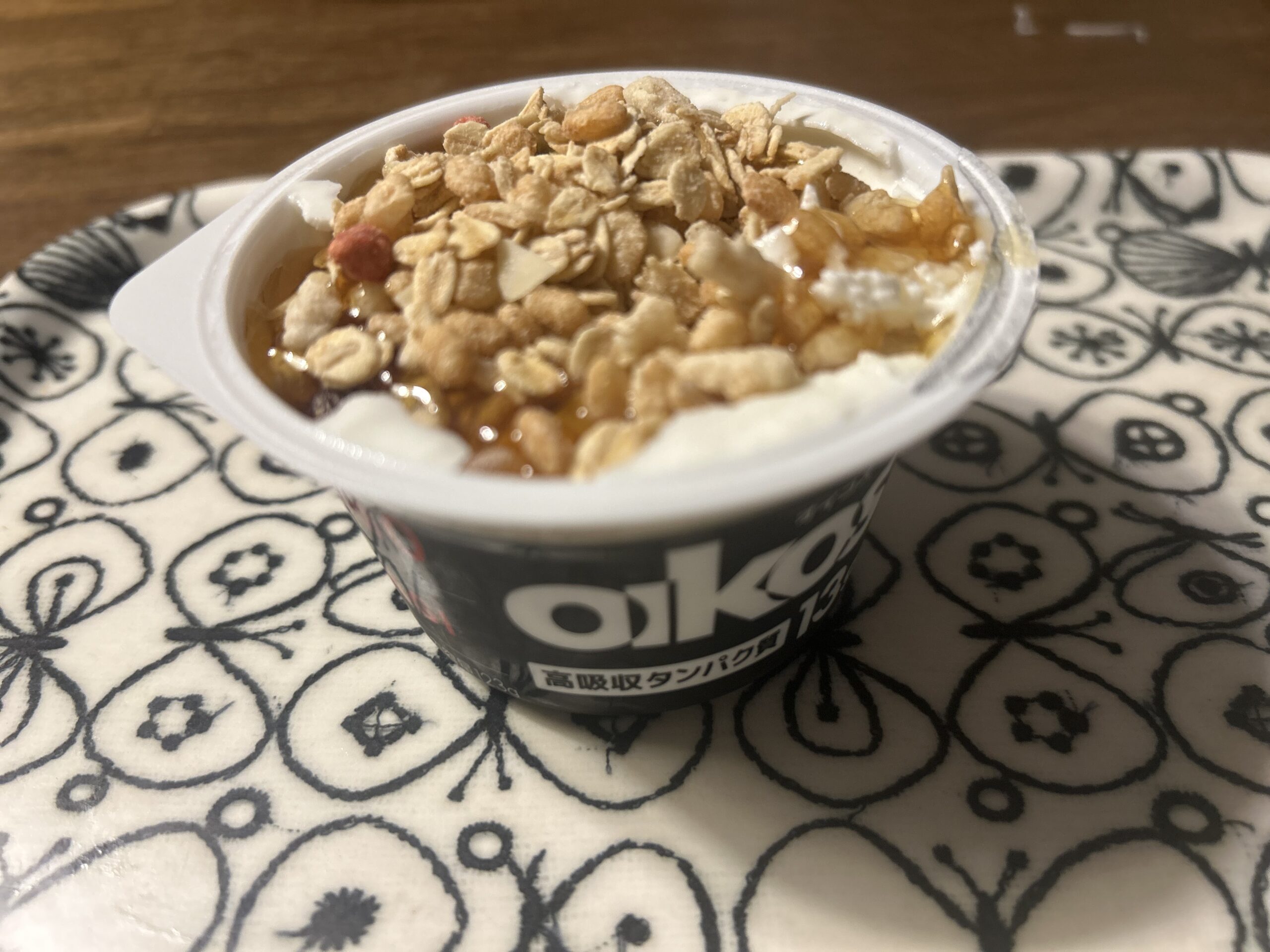 オイコス✖️グラノーラ✖️ハチミツ 水分控えめのヨーグルトにグラハチがお気に入りとか。
