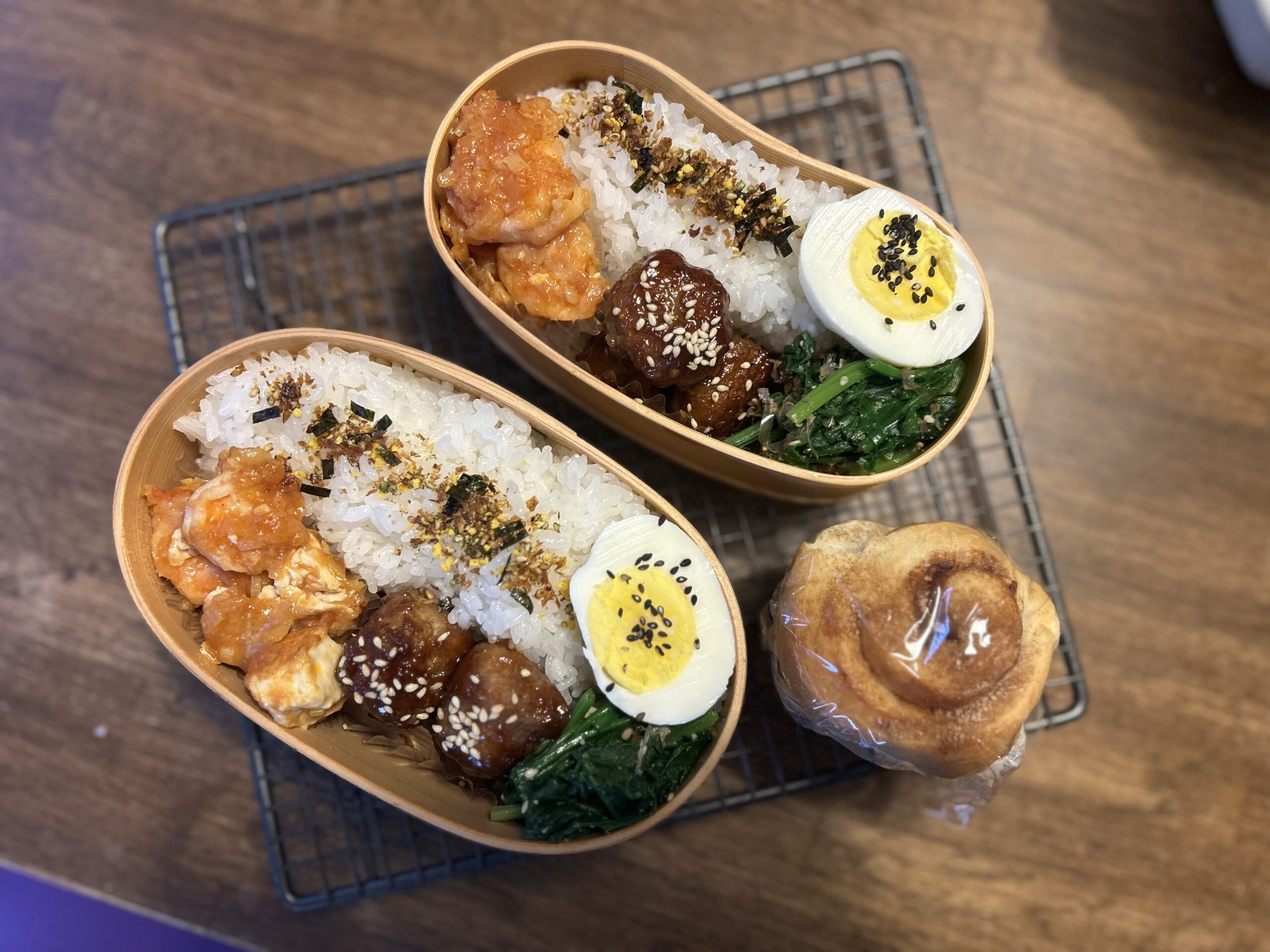 今日のお弁当は中華弁当、エビチリに肉団子だよ。シナモンロールも添えて、初めて昨日焼いてみたら家族に大好評!