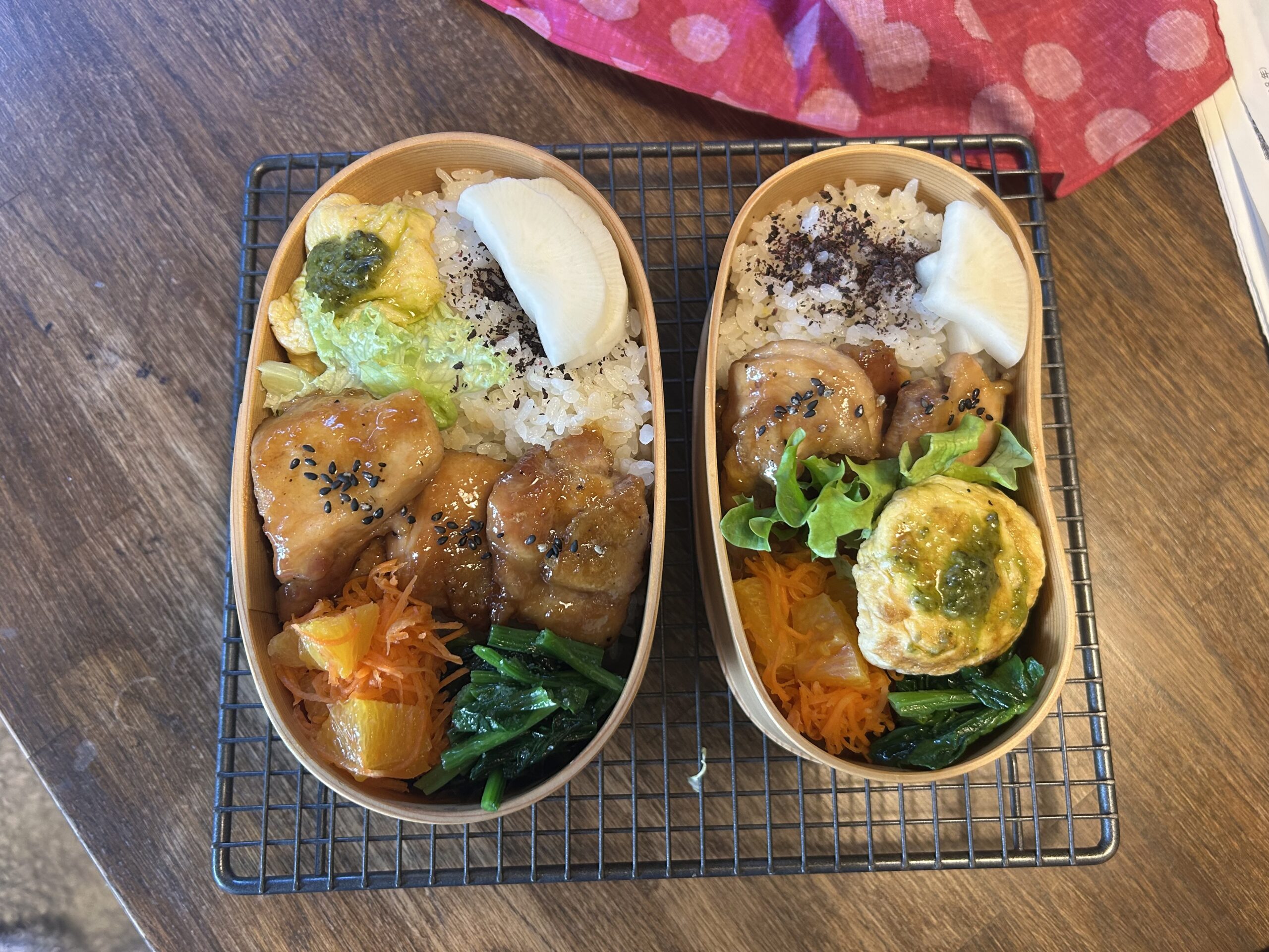 鶏の照り焼き オムレツバジルソース ほうれん草のナムル ブラッドオレンジ入りキャロットラペ 義母手製沢庵