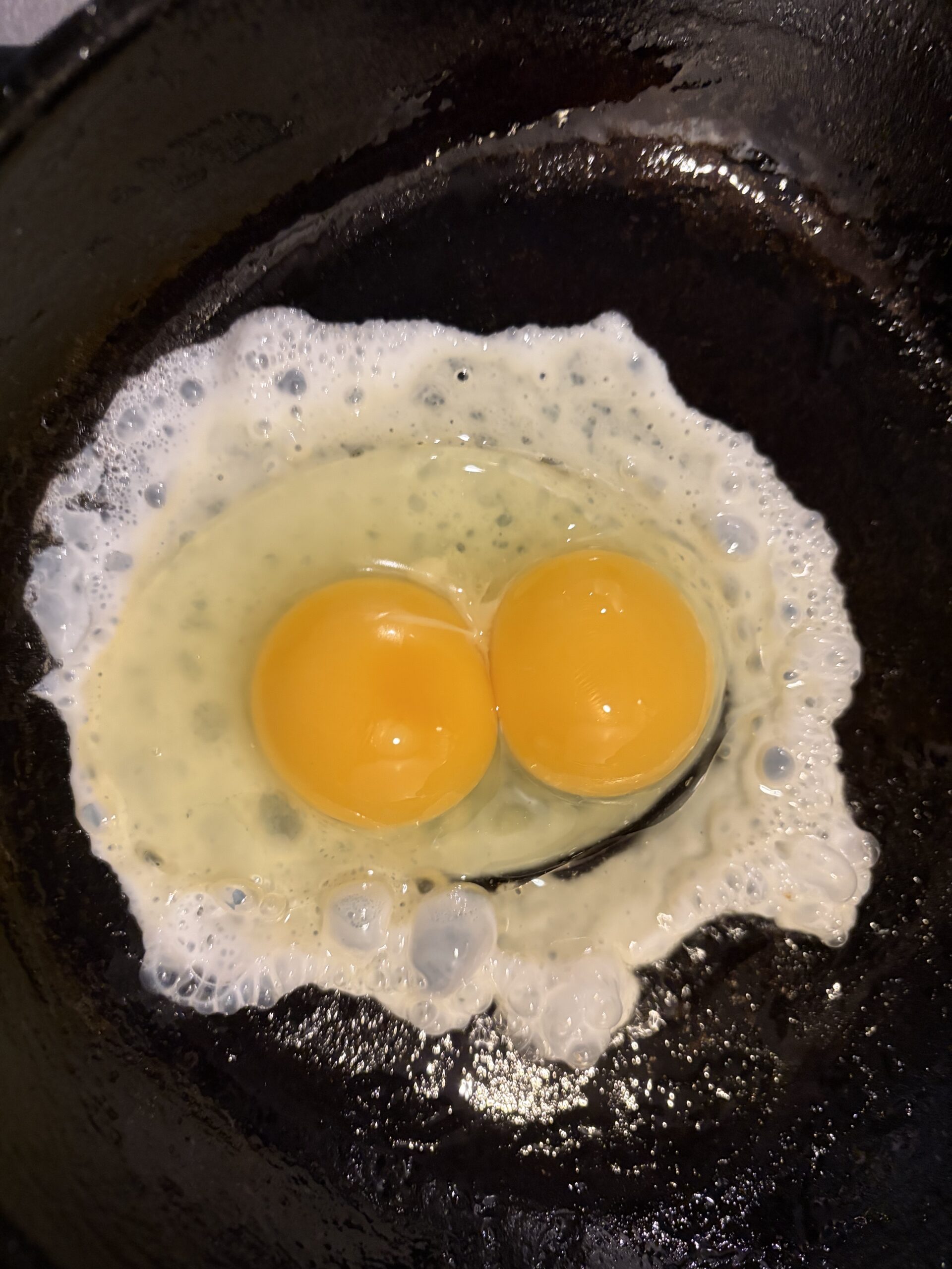 朝ごはんにタンパク質を、目玉焼きを作ろうと卵を一つ割ると、フライパンの上にふたごちゃんが!!