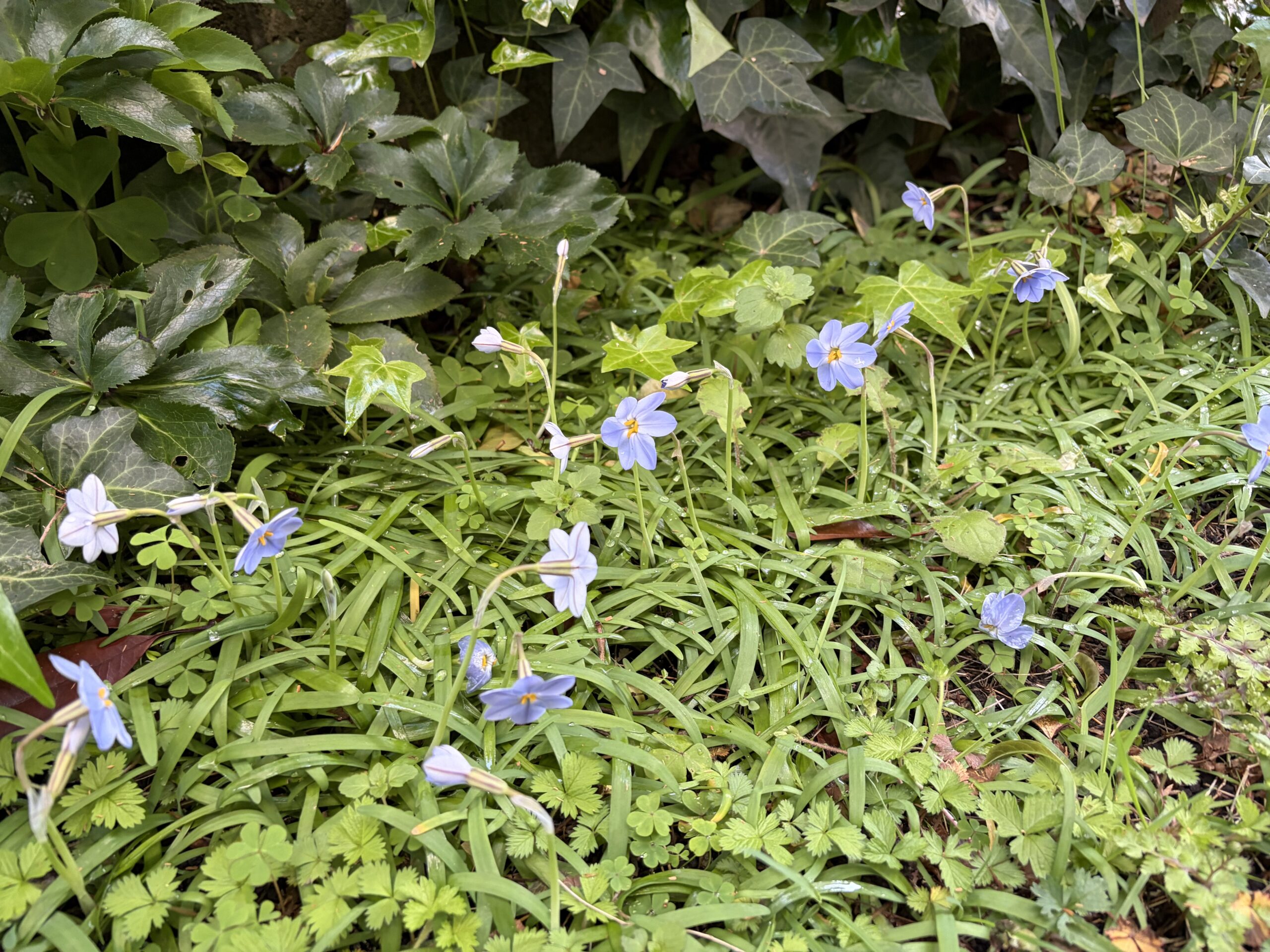 この時期、ニラみたいな葉っぱから沢山さいてくるブルーのお花が庭中咲いている。