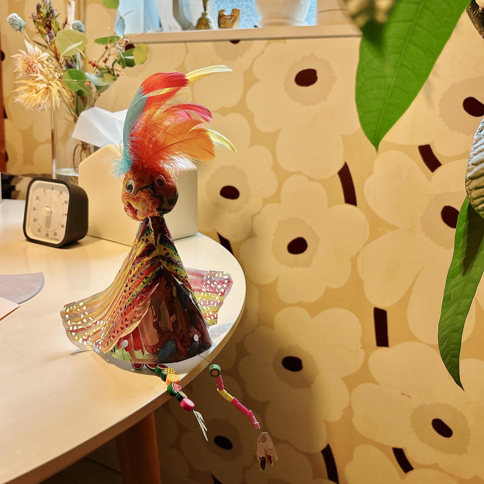 と、書きながらにして早速午前中に次男が造形教室で作ってきた鳥。これ以上無いくらいにカラフルで良い感じなので、もちろん飾るよね。というわけでまたひとつ物が増える我が家なのであった。