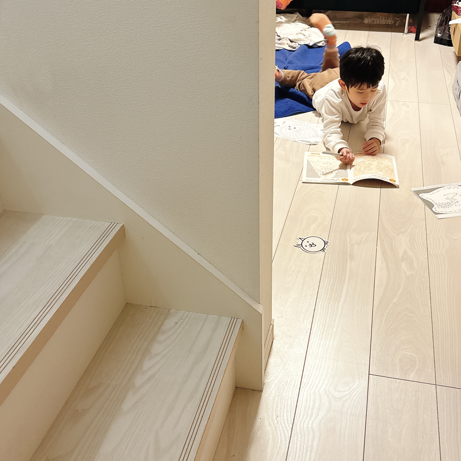 朝の長男は何故かわざわざ足場の悪いソファの上に立ち上がり、ふらふらしながらズボンを履いているし、夜の次男はテーブルがあるのに熱心に床で何かを書いている。