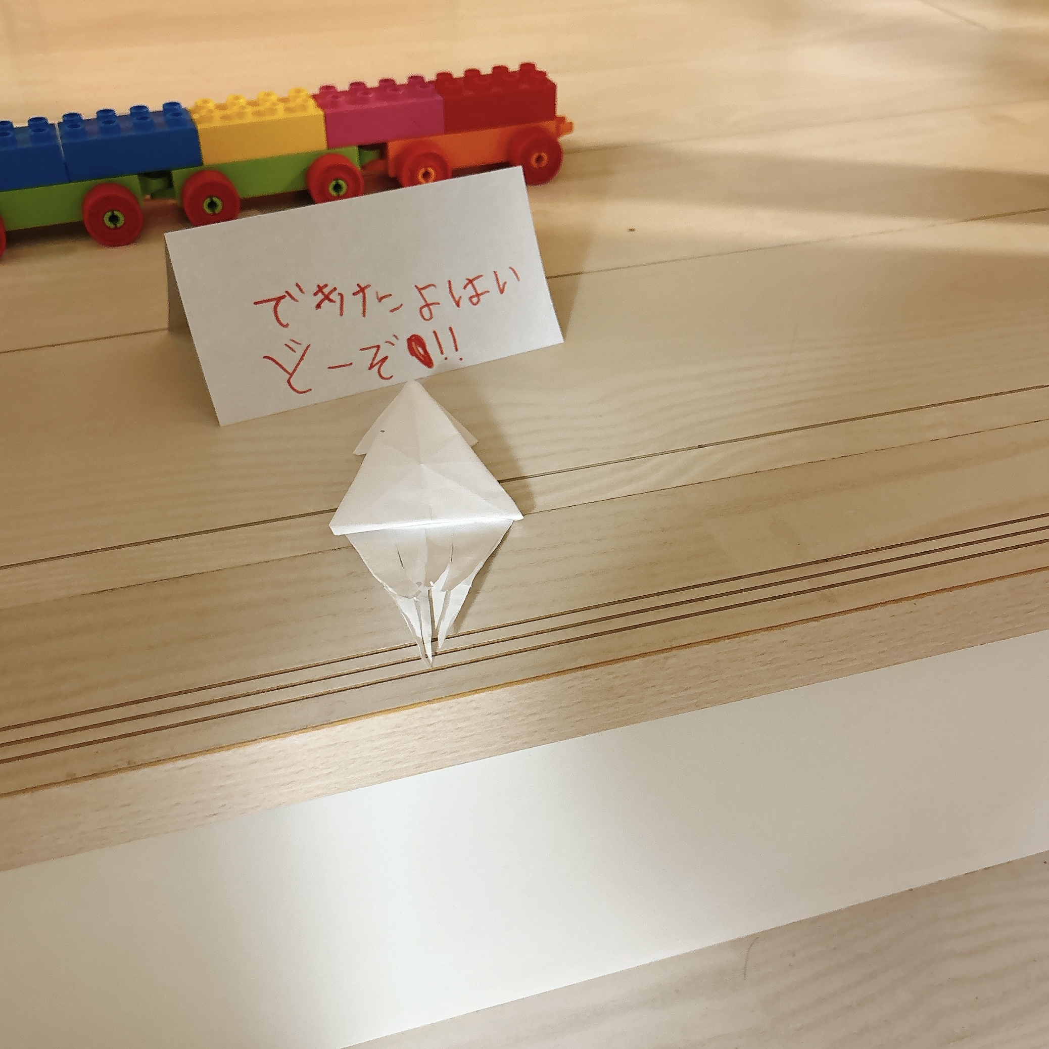 てなわけで今日はどんな出来事があったかというと、果たして第何期?の折り紙大ブーム中の次男からの贈り物を受け取ったのがハイライト。階段を上り切ったら