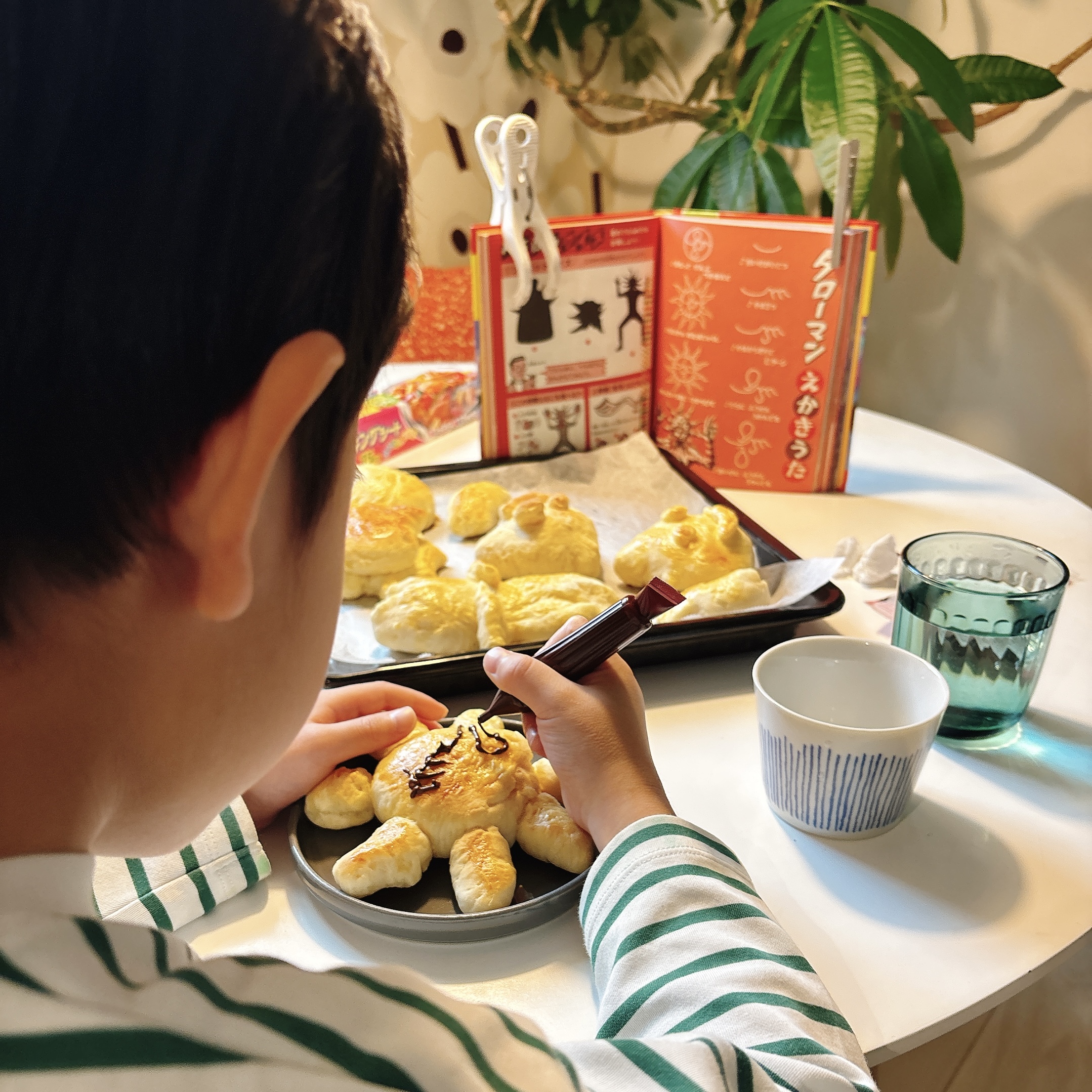 我が家にはないものばかりだったので、まず次男と材料を買いに行く。我が家には強力粉もなけりゃ、ドライイーストもない苦笑 材料を揃えて粉を混ぜて、こねて、私たち今パンをつくってます!って感じ満載。成形されたパンをオーブンで焼けば、実にシンプルなパンが完成した。次男は本のレシピに忠実に、嬉々としてタローマンの顔をチョコペンで描いた。物語の中で迎合の象徴として登場したタローマンパン、みんなでそれをお昼に食べる。良い一日だ。