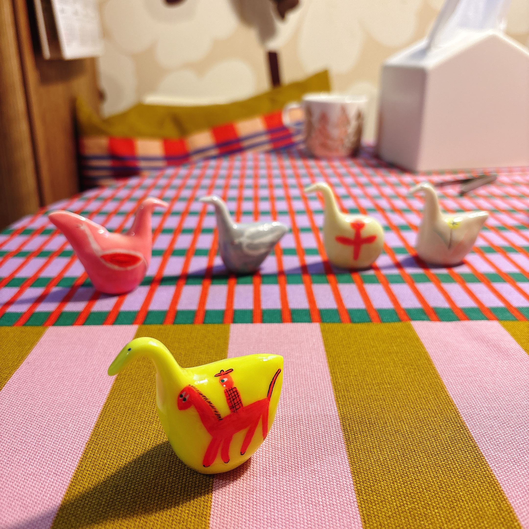 渡邉さんが作る鳥のオブジェを少しずつ集めており、今回も個展でひとつ購入させてもらった。見ると幸せな気持ちになる色と艶やかな質感とほっこりフォルム。