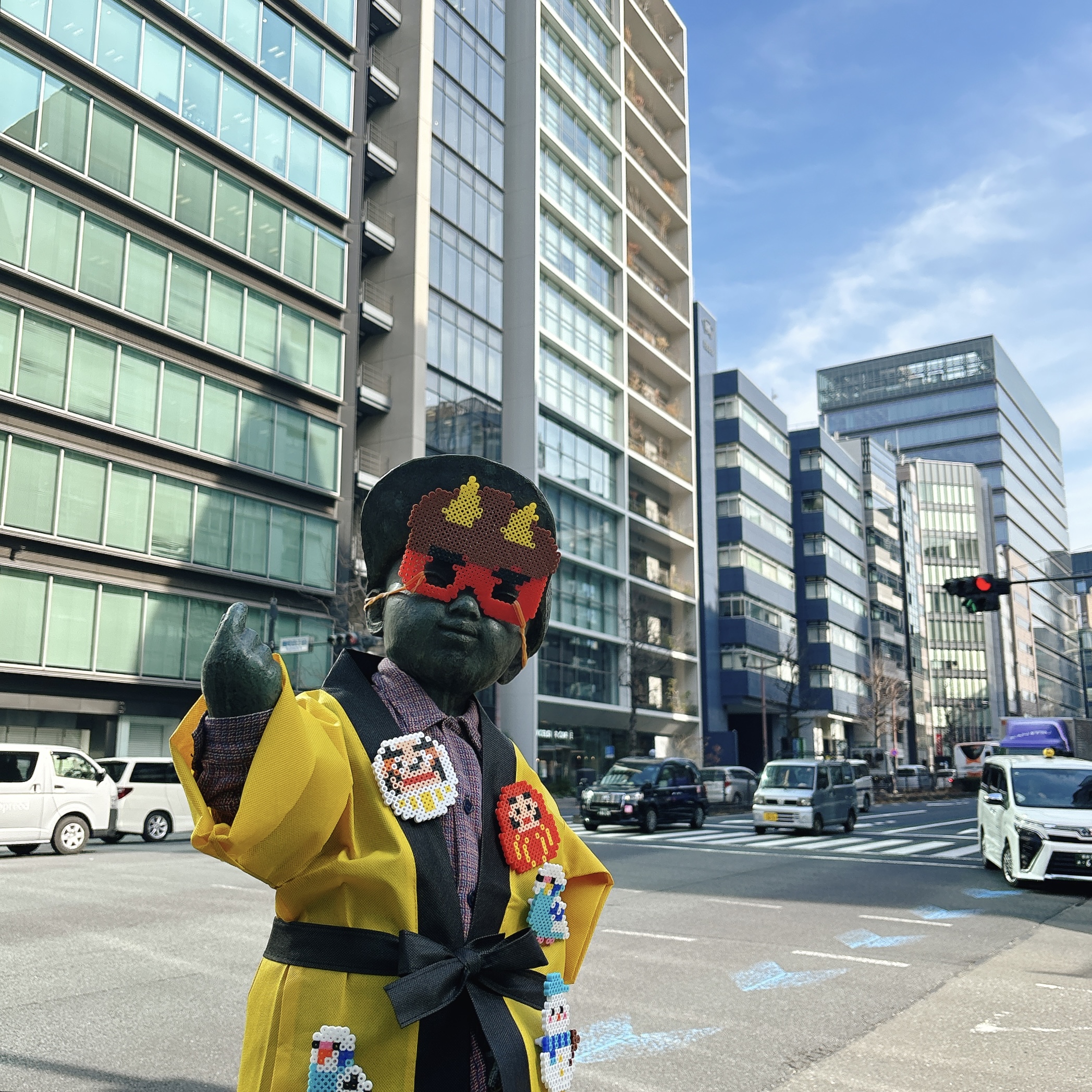昼休みに用事があって、久々に普段あまり行かない側に向かったところ、大通りの横にある少年像の格好があまりにもファンキーだった