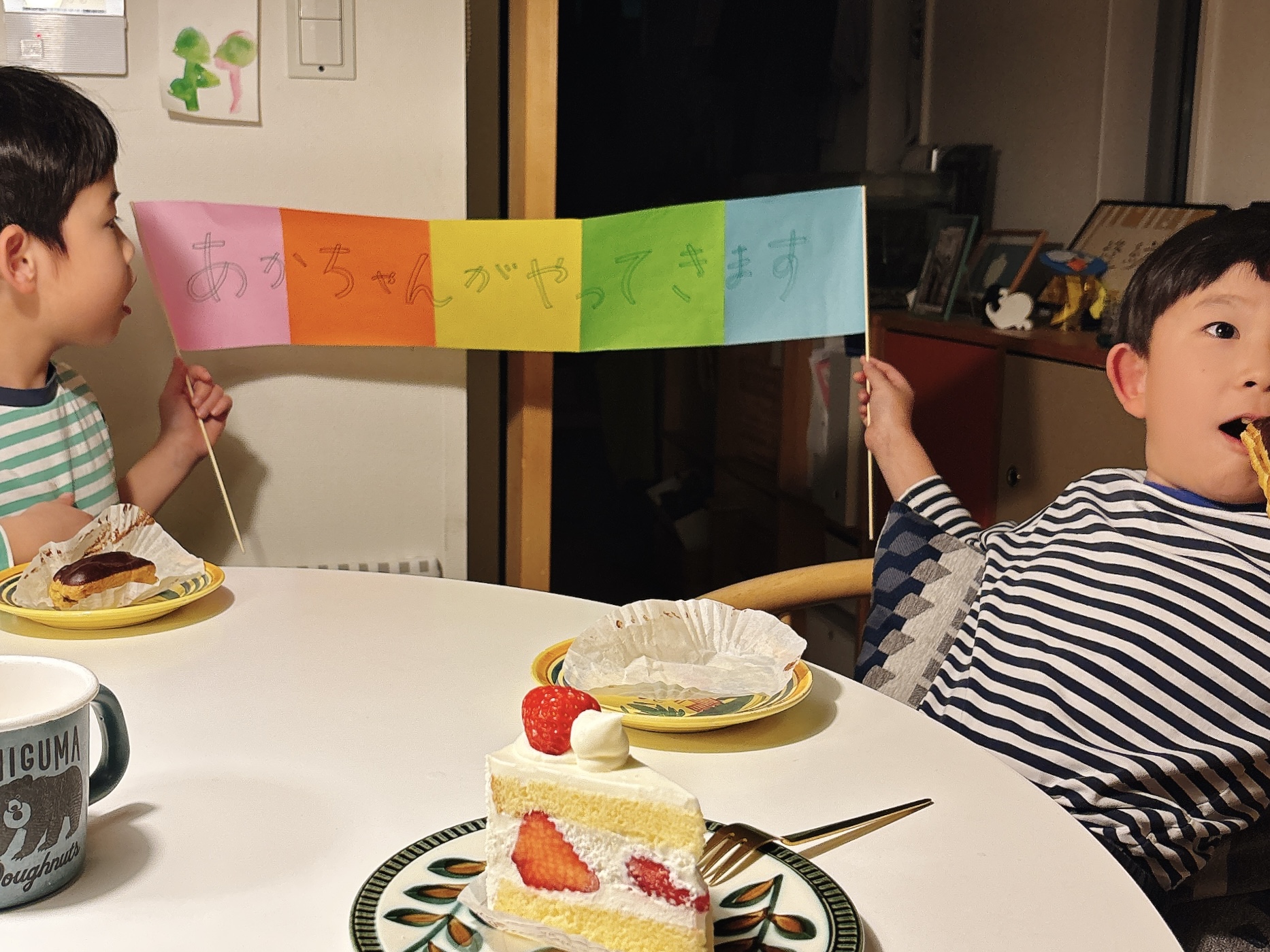 息子たちに我が家のニューカマーについてどう伝えようかと思ったが、とりあえず特別なときはケーキ!ってことで。近くのケーキ屋さんでショートケーキといちごパイ、エクレアを買って帰る。夕食後に食べながら発表することにした。本当ならくす玉でも割りたい気分だったけれど、急遽で準備できなかったので、ごく簡易的な横断幕のようなものを作る。くるくると巻いておき、息子たちに広げながら、読み上げてもらった。