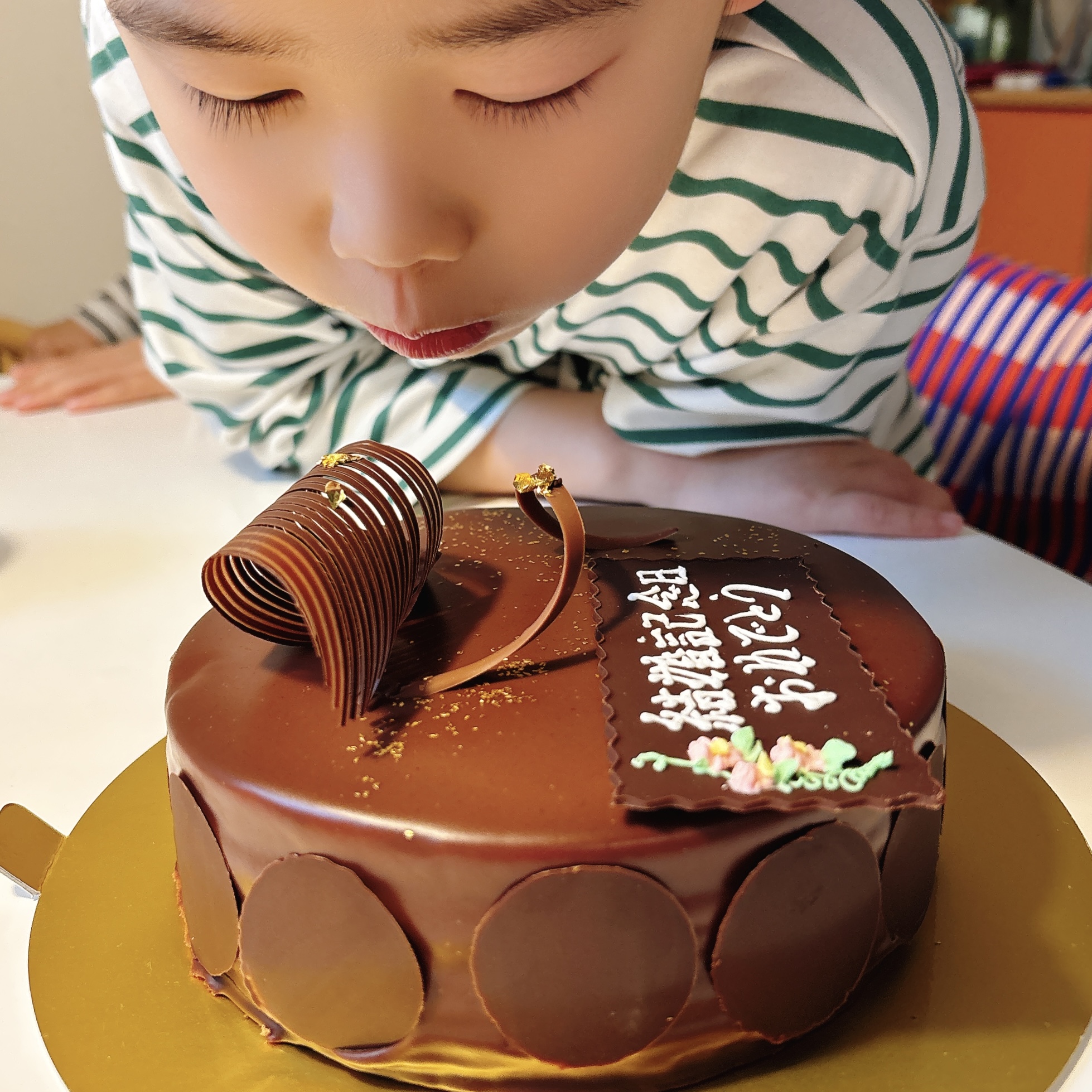 昨日食べる予定だった結婚記念日のケーキを囲む。次男が顔を近づけて何をしているかというとふーっと吹くと揺れる金箔に釘付けです。