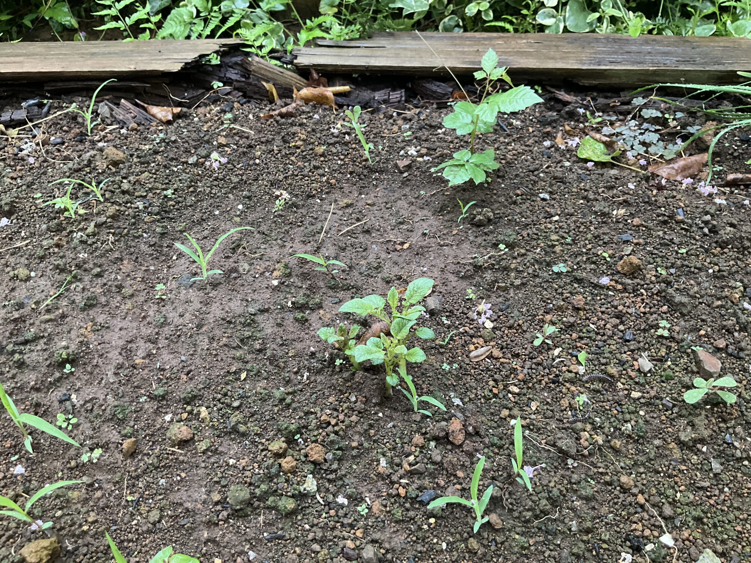 庭の畑に埋めたジャガイモの種イモからようやく芽が出てきた。夏休みにホームセンターで買ったアイマサリの種イモ15個。涼しくなってから埋めるのがおすすめ、みたいな感じだったけど、先送りすると暇がなくなるかもしれないので8月17日に植えてしまった。その後も猛暑が延々続き、芽は一向に出てこないので、ダメになってしまったか?と心配していたが、とりあえず芽が出てきてうれしい。果たして芋は育つかな?この先の生育が楽しみ。