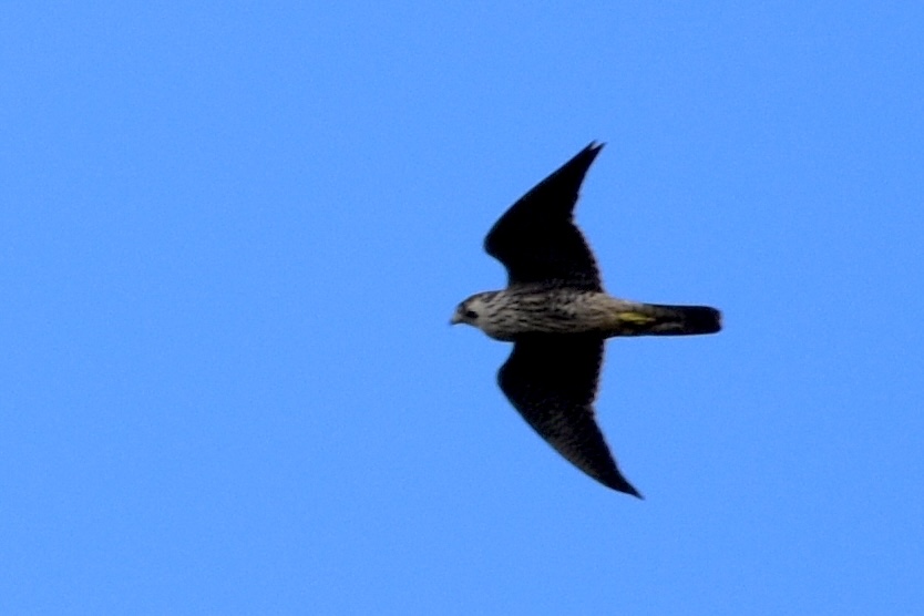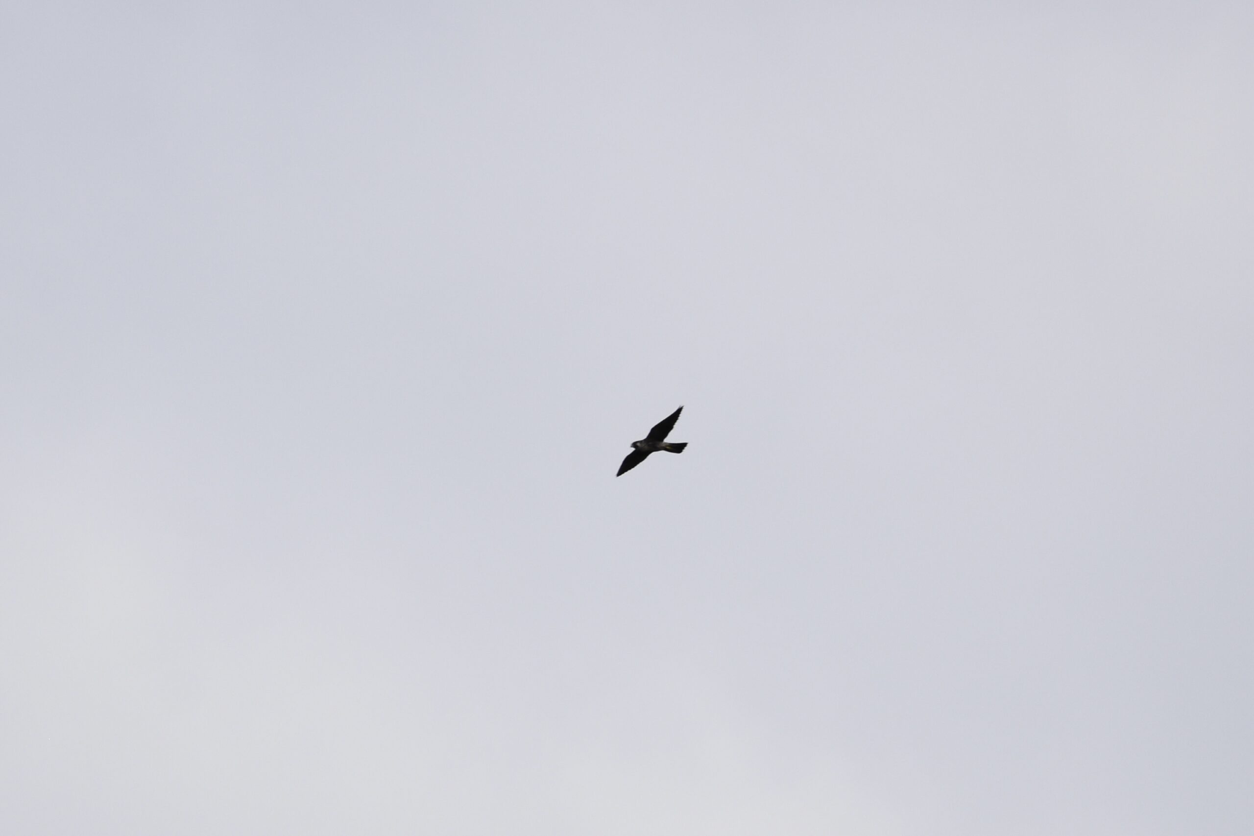 ということで、展望台で一人になったけど、まあこの天気だし、何らか飛ぶだろう、とのんびり滞在。今日は遠くに筑波山も見えて空気はそれなりに澄んでいる。標高200メートルの山頂は風が涼しくて気持ちがいい。タカはどの方向から現れるかわからないし、意外と速度は速いので、視線を広範囲に巡らせてセンサーを鋭敏に張って待つ。広大な空に向き合って、感覚が研ぎ澄まされていくのが心地良い。結局1時間半ほど見ていて、渡りをするサシバ、ハチクマは見られなかったが、チョウゲンボウとハヤブサを見られた。ハヤブサは腹の斑紋が縦縞の若い個体。強い風を自在に捉えてダイナミックな飛翔を見せてくれた。ただ少々遠かった。