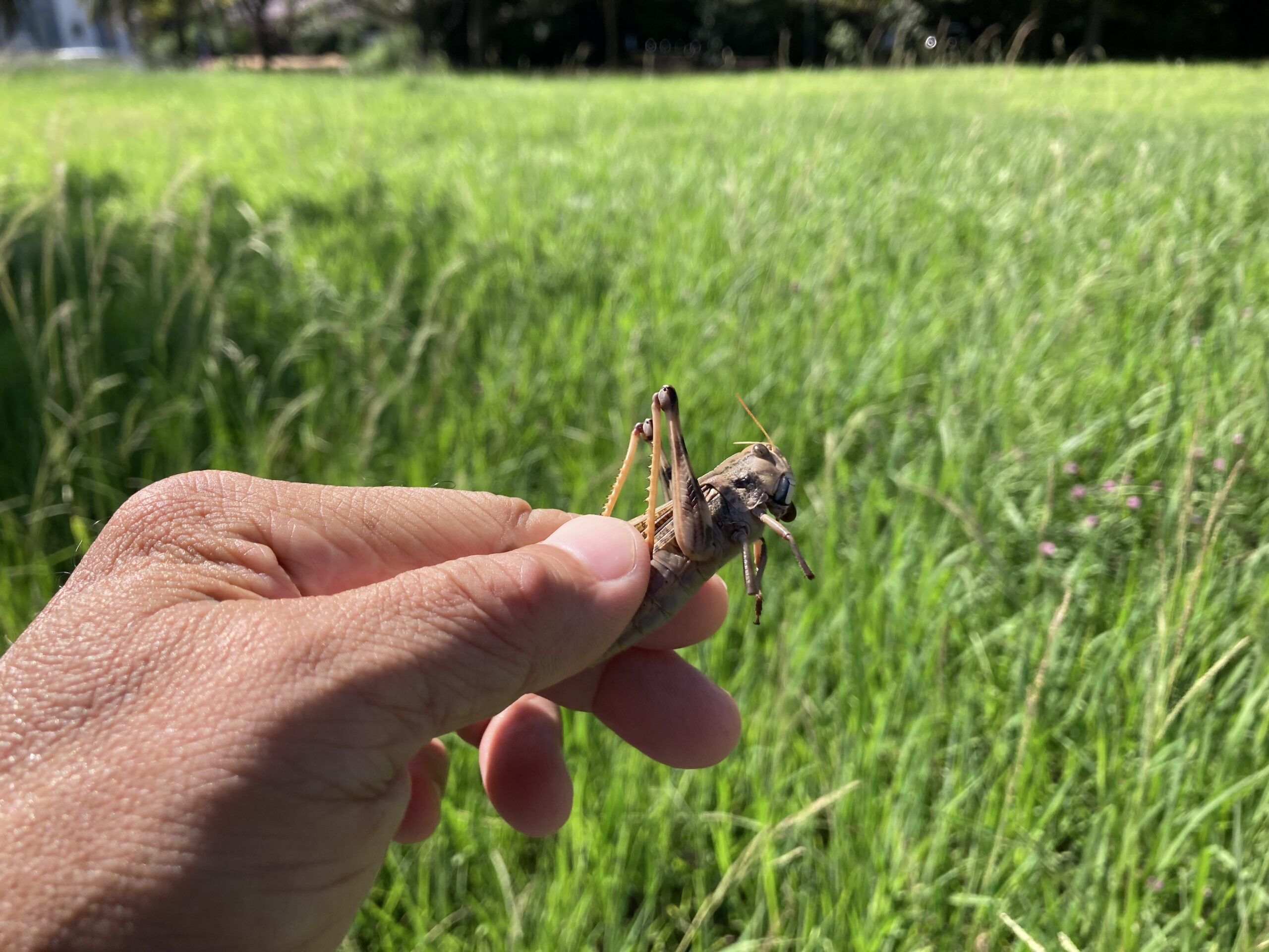 ランニング中、草の先にトノサマバッタがいるのを見つけたので、つい捕まえる。幼少期、虫捕りに命をかけている子どもだったので、今でも目の前にこういう虫が出てくると手が出る。トノサマバッタは夏の終わりから秋にかけて成虫が出てくる。飛翔力が強いので幼児には手強い相手だけど、網を持って草はらを走り回ってずっと追いかけ回していた。